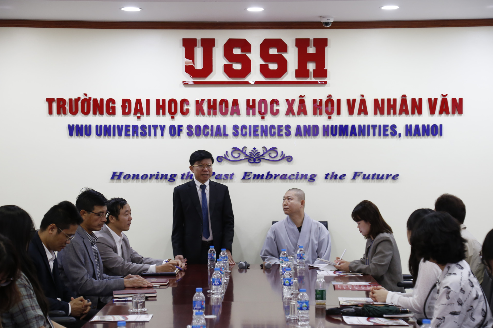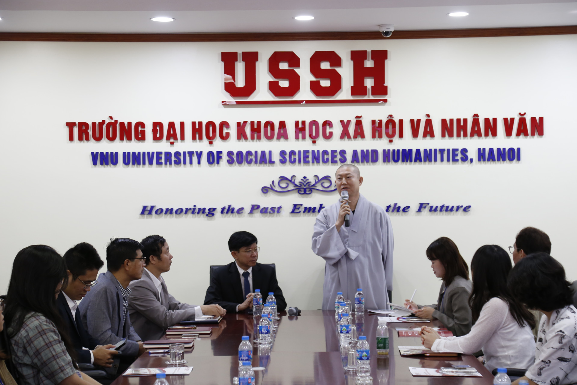 在会晤中,黄英俊教授表示非常荣幸欢迎韩国代表团来访并参与学院的各项活动。他强调,在全球化和文化交流日益深入的背景下,促进两国学生之间的交流项目不仅具有文化体验意义,更是加强越韩两国教育、科研和学术交流领域合作的战略举措。“学院始终重视国际交流活动,特别是那些旨在连接年轻一代的项目——他们将传承和弘扬两国文化价值观和友谊精神。我们希望,此次访问之后,社会科学与人文学院与月精寺文寿青年会能够继续拓展在科研、培训和佛教文化交流等领域的合作项目。”黄英俊教授说道。