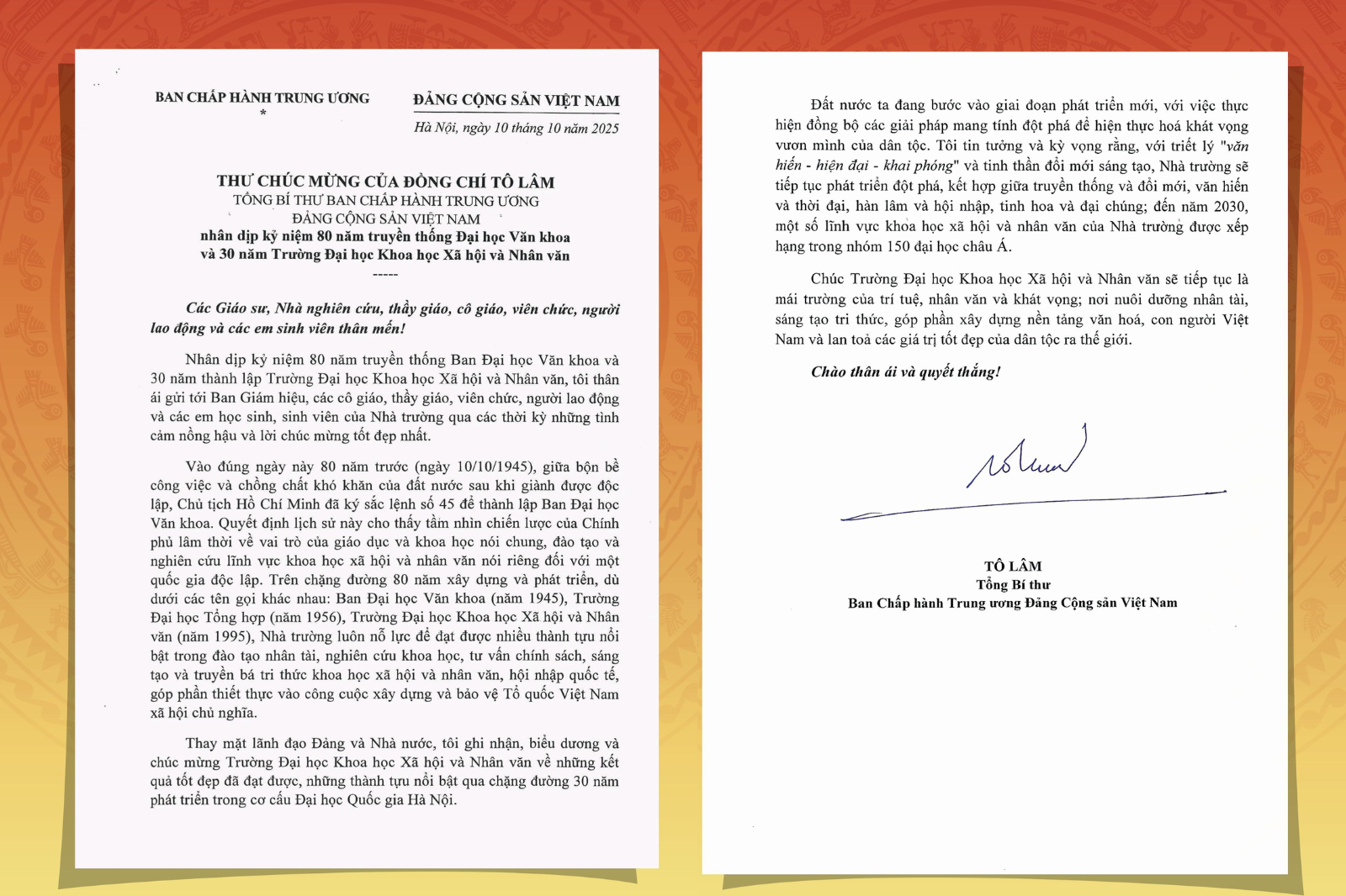 On the occasion of the 80th anniversary of the tradition of the University of Letters and the 30th anniversary of the establishment of the University of Social Sciences and Humanities, Vietnam National University, Hanoi, Comrade General Secretary of the Central Executive Committee of the Communist Party of Vietnam To Lam sent a congratulatory letter, expressing the deep concern of the Party and State for the education, training and research career of the University.