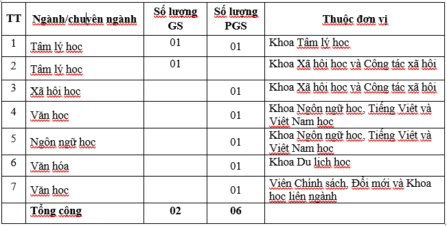 Based on the strategic development plan of the University of Social Sciences and Humanities, the University announces the number of professors and associate professors to be appointed to the following majors in 2025: