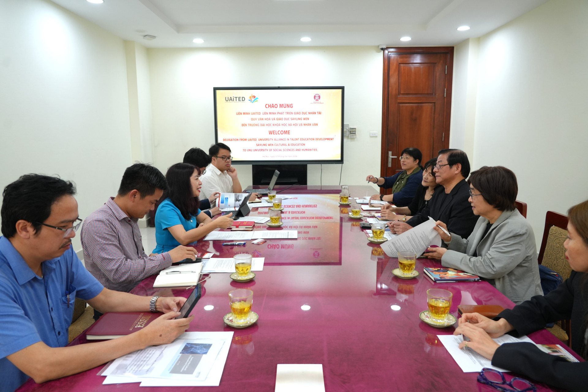 Đại diện Quỹ Sayling Wen có ông Jeter Her (Giám đốc Điều hành Quỹ Sayling Wen), đại diện Liên minh UAiTED có bà GS. Herng Su (Phó Hiệu trưởng Đại học Quốc lập Chính trị Đài Loan), GS. Yi-Ning Chen (Trưởng bộ phận Hợp tác Quốc tế, Đại học Quốc lập Chính trị Đài Loan), bà Ruru Lu (Cố vấn Liên minh UAiTED) và bà Nora Liu (Quản lý Dự án cấp cao, Quỹ Văn hóa và Giáo dục Sayling Wen, Thư ký điều hành UAiTED).