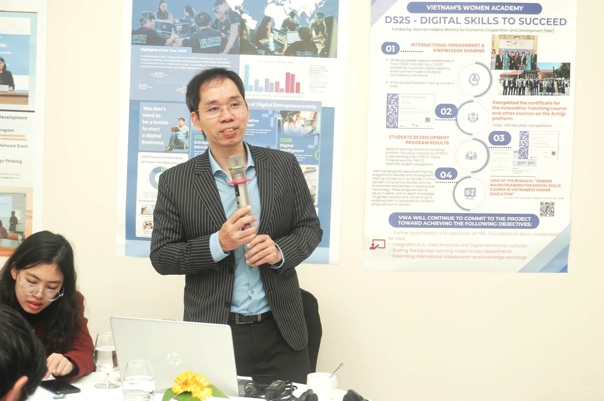 PGS.TS. Đỗ Văn Hùng - Đại diện Trường Đại học Khoa học Xã hội và Nhân văn, ĐHQGHN (USSH) đã giới thiệu những kết quả nổi bật của nhà trường trong khuôn khổ dự án DS2S. Trong dự án này, USSH đóng vai trò đối tác dẫn dắt (Lead Partner) trong phát triển nội dung và triển khai học thuật, đặc biệt trong việc xây dựng khóa học “AI for Teaching and Research” dành cho giảng viên, phối hợp với các đối tác quốc tế như GIZ và Conoscope.