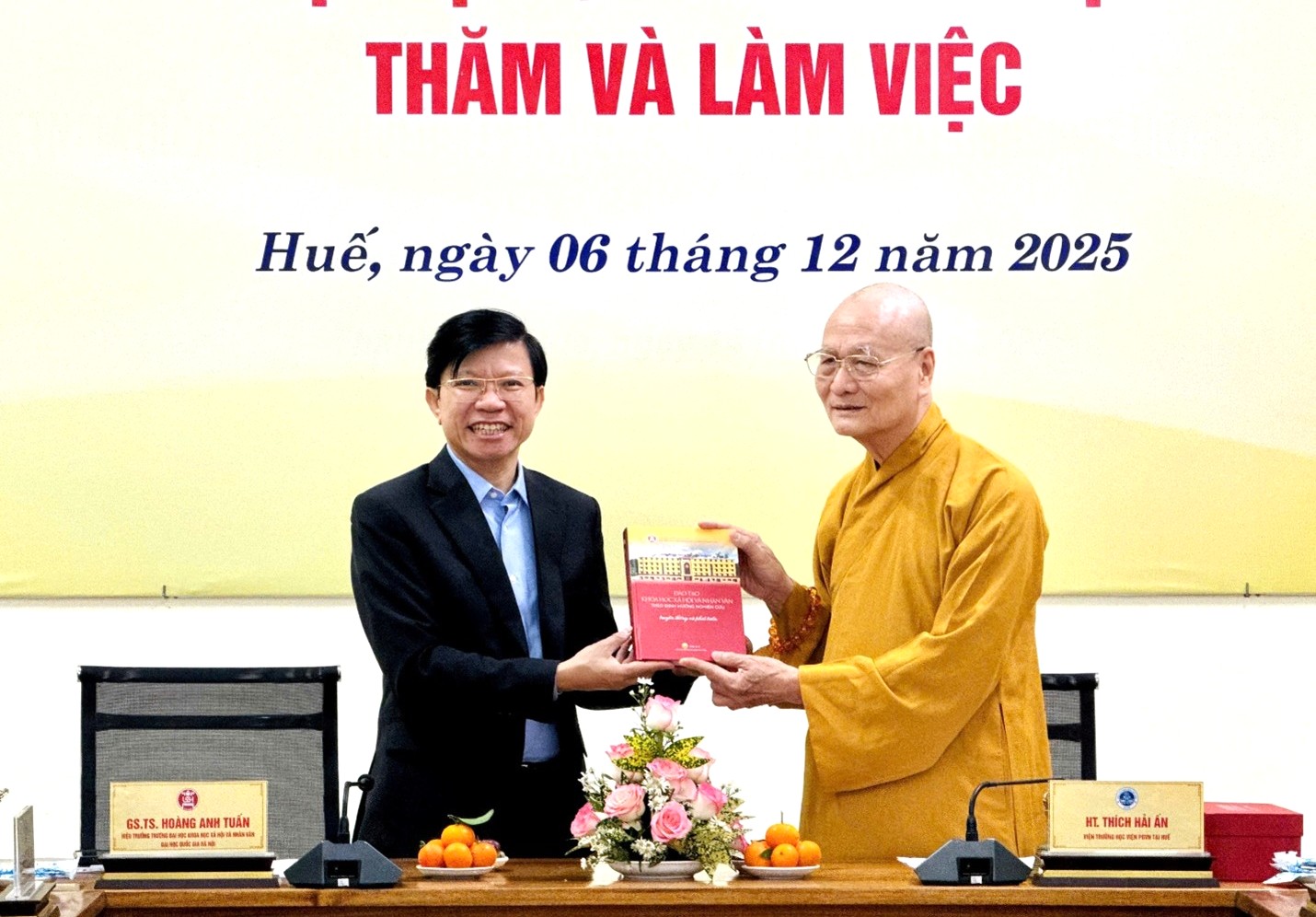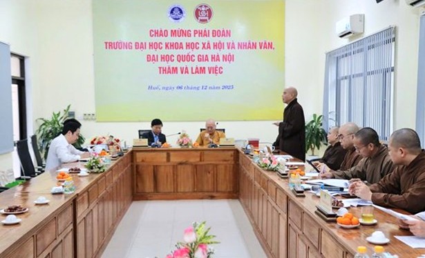 Tại buổi làm việc, Hoà thượng Viện trưởng Thích Hải Ấn đã gửi lời chào mừng và bày tỏ niềm hoan hỷ khi được tiếp đón Hiệu trưởng Trường Đại học Khoa học Xã hội và Nhân văn, Đại học Quốc gia Hà Nội và các thành viên trong đoàn công tác.