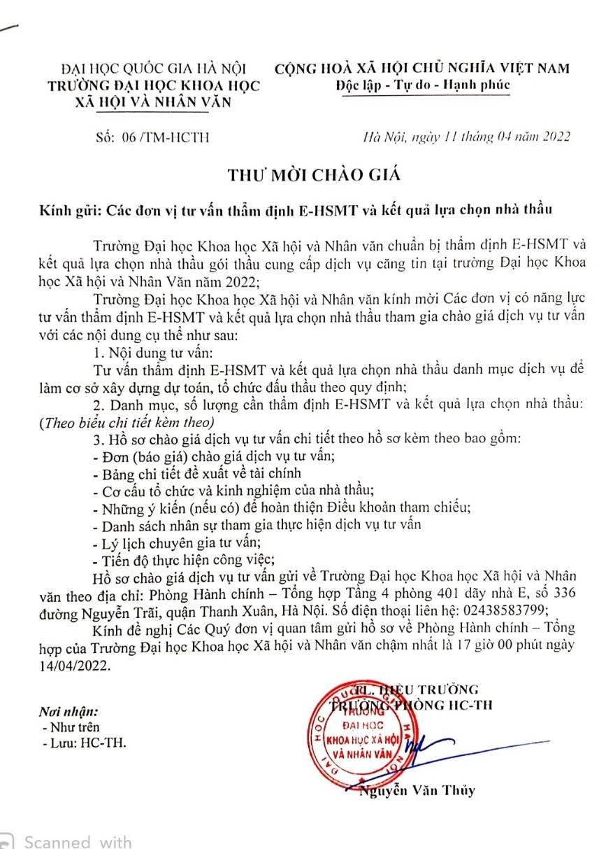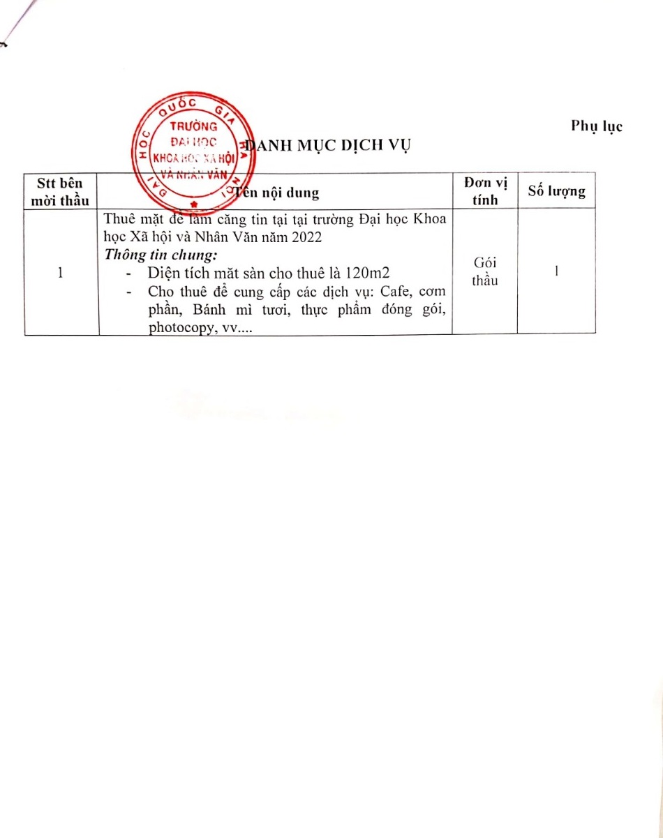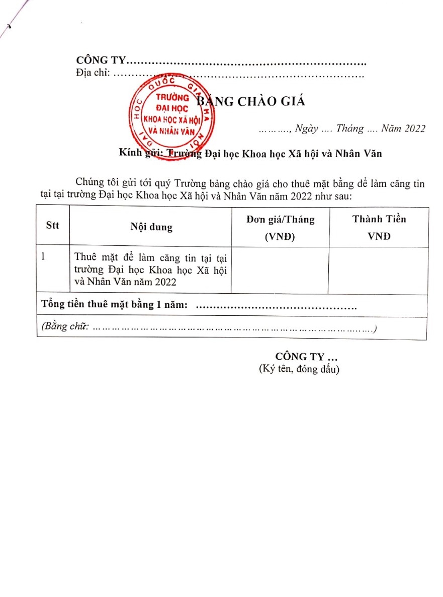 1. Mời các đơn vị, công ty, cá nhân tham gia chào giá cạnh tranh: Thuê mặt bằng làm căng tin tại trường ĐHKHXH&NV năm 2022. Địa chỉ: 336 đường Nguyễn Trãi, quận Thanh Xuân, TP Hà Nội.