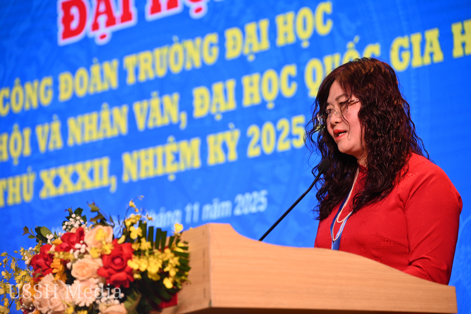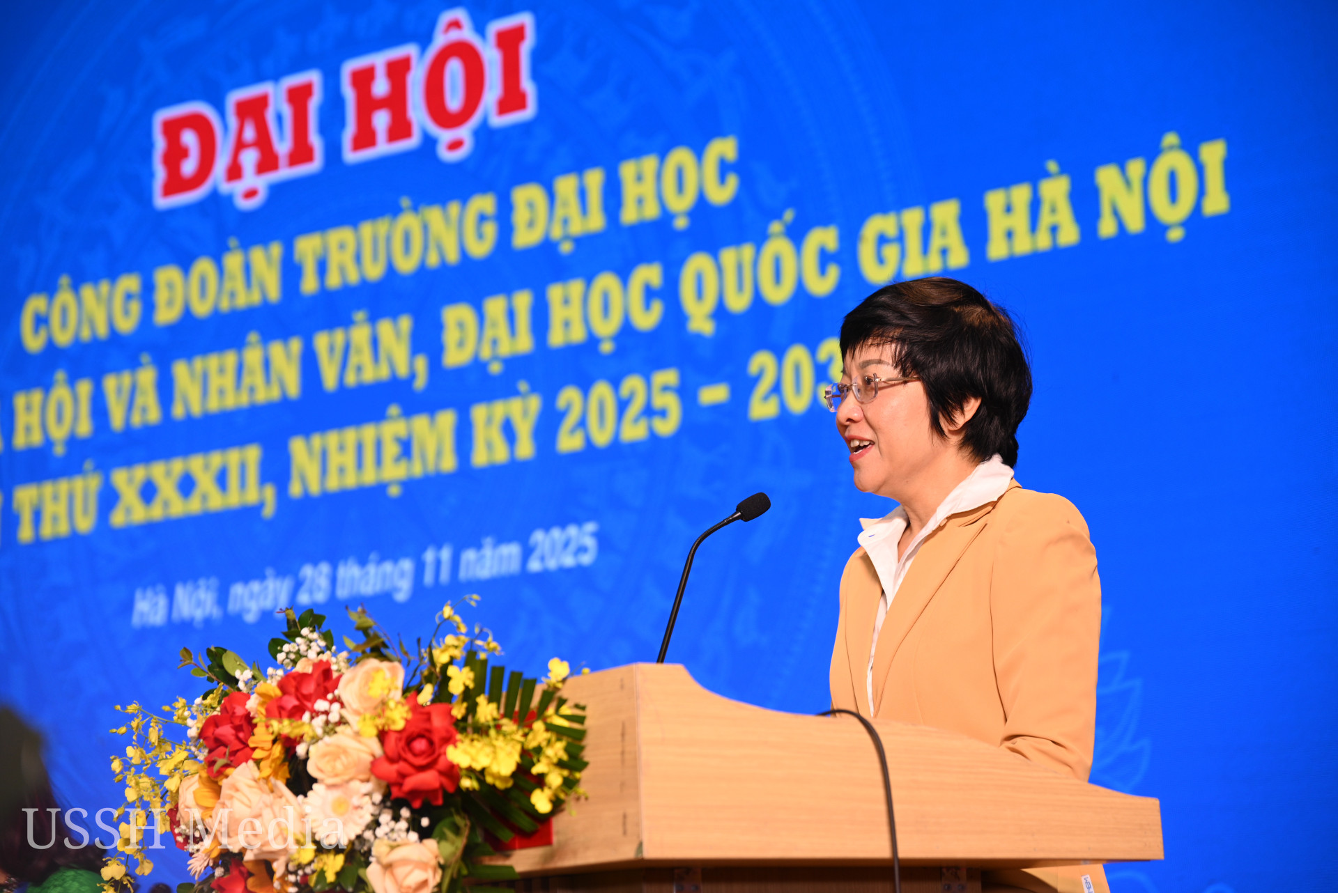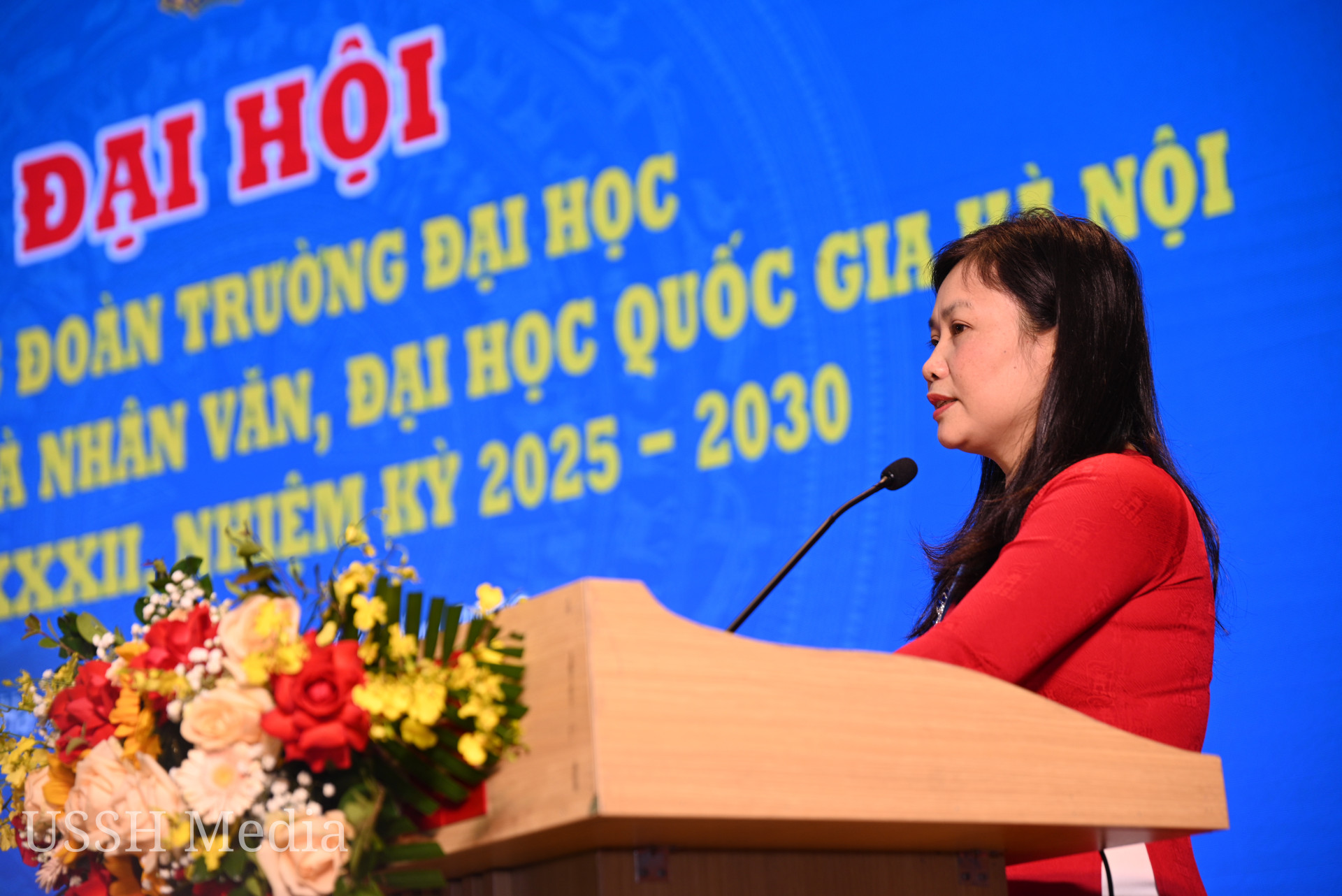Phát biểu tại Đại hội, đồng chí Nguyễn Thị Thảo - Chủ tịch Công đoàn Đại học Quốc gia Hà Nội ghi nhận và đánh giá cao sự nỗ lực của Công đoàn Trường trong nhiệm kỳ vừa qua. Đồng chí nhấn mạnh, Công đoàn Trường đã khẳng định được năng lực mạnh mẽ ở những lĩnh vực tưởng chừng không phải thế mạnh của Trường Đại học Khoa học Xã hội và Nhân văn, đặc biệt là công nghệ, chuyển đổi số và ứng dụng AI trong hoạt động công đoàn và chuyên môn. Đây là minh chứng rõ ràng cho tinh thần đổi mới, sự năng động, sáng tạo và chuyên nghiệp của đội ngũ cán bộ công đoàn và viên chức Nhà trường. Các hoạt động của công đoàn Nhà trường luôn được tổ chức với quy mô, sự chuyên nghiệp, bài bản, đậm nét nhân văn.