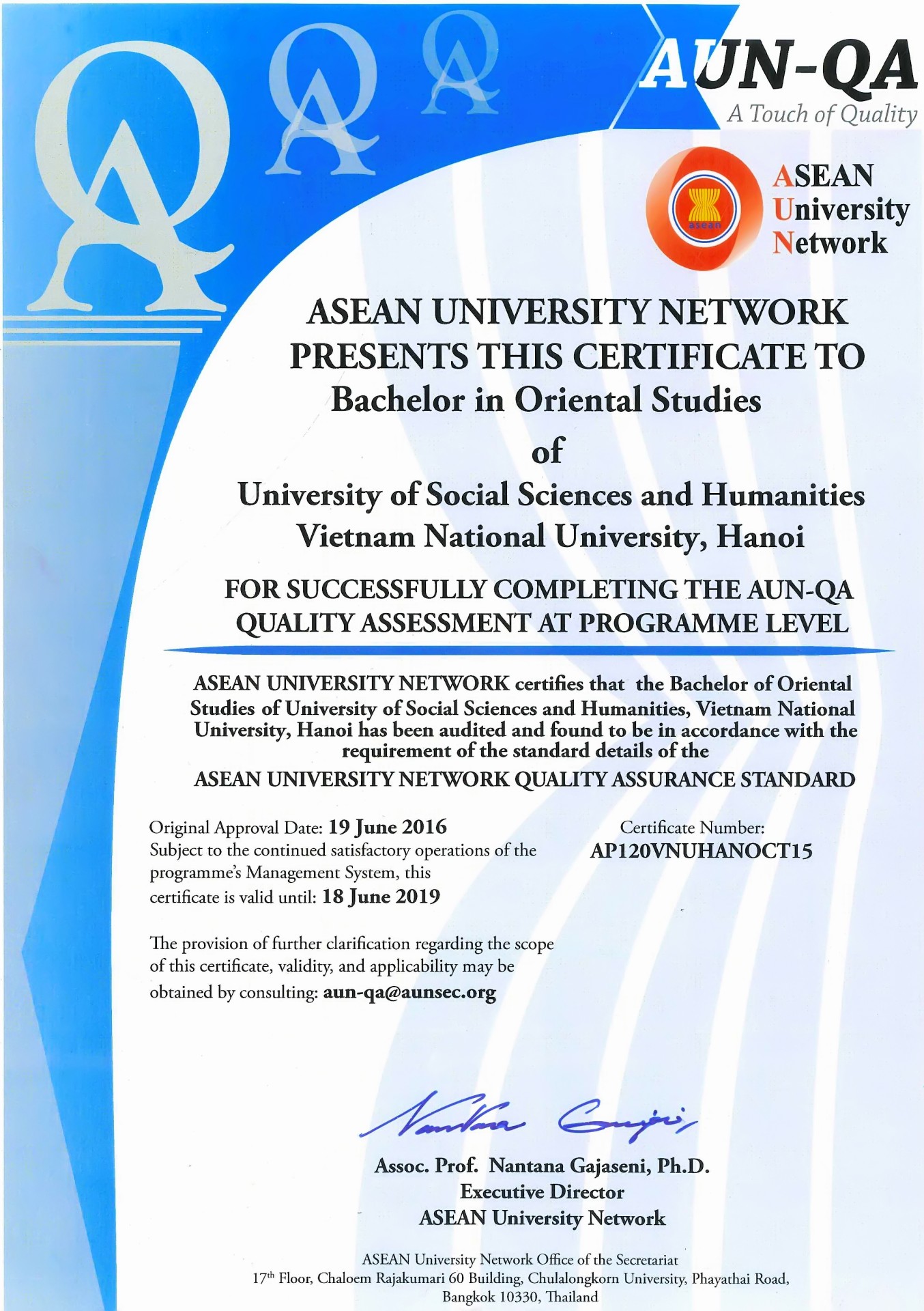 Chứng nhận của AUN đối với chương trình đào tạo cử nhân ngành Đông phương học