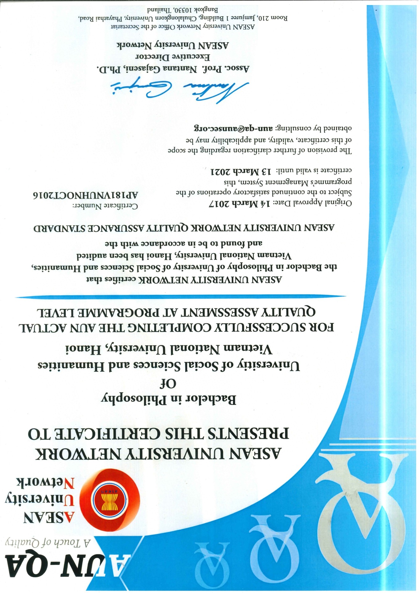 Chứng nhận của AUN đối với chương trình đào tạo cử nhân ngành Triết học