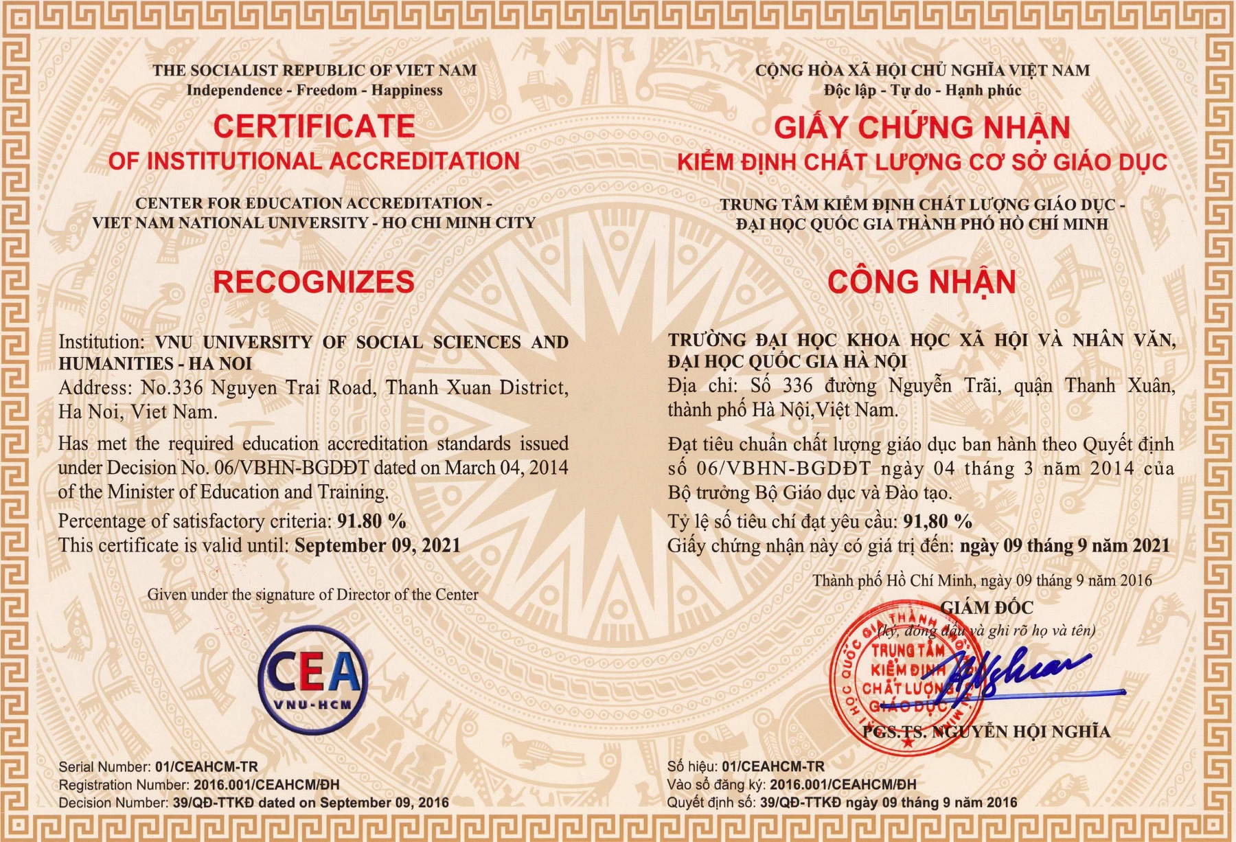 Chứng nhận của TT KĐCLGD ĐHQG công nhận trường ĐHKHXH&NV đạt tiêu chuẩn chất lượng giáo dục