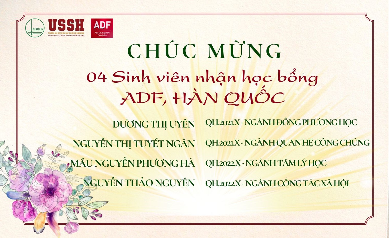 Trong nhiều năm qua, Quỹ phát triển châu Á đã trao nhiều suất học bổng giá trị tới sinh viên của các ngành học của Đại học Quốc gia Hà Nội nói chung và Trường Đại học Khoa học Xã hội và Nhân văn nói riêng. Các em sinh viên vinh dự nhận học bổng năm nay đến từ các ngành Đông phương học, Quan hệ Công chúng, Tâm lý học, Công tác Xã hội của VNU-USSH.