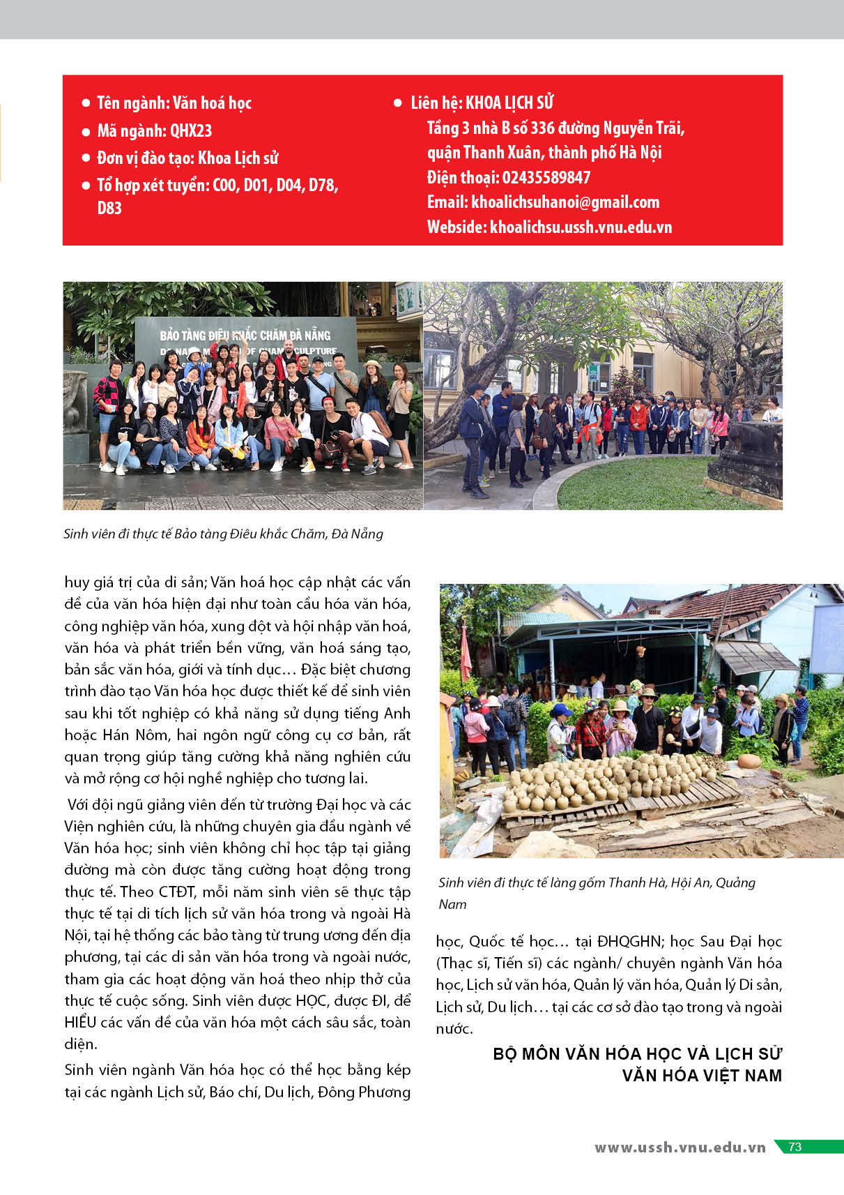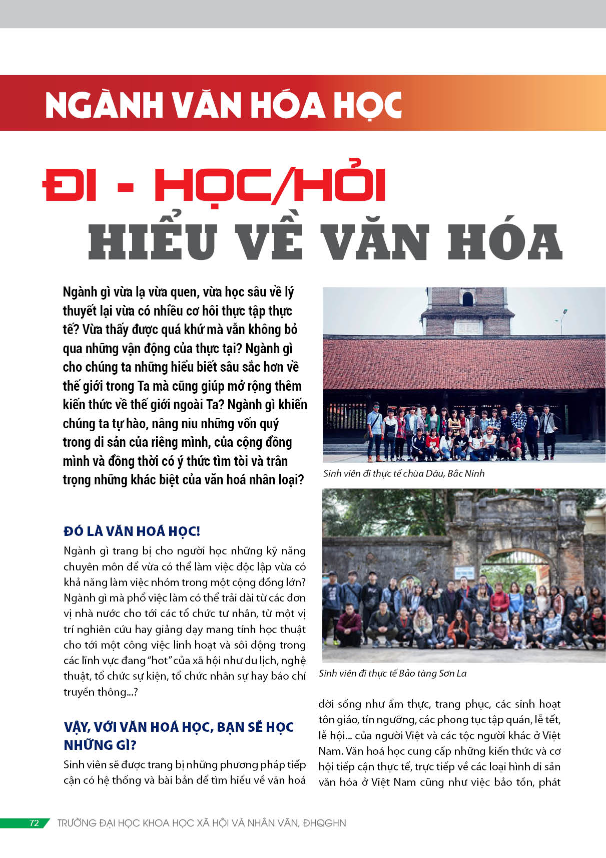 Ngành gì vừa lạ vừa quen, vừa học sâu về lý thuyết lại vừa có nhiều cơ hôi thực tập thực tế? Vừa thấy được quá khứ mà vẫn không bỏ qua những vận động của thực tại? Ngành gì cho chúng ta những hiểu biết sâu sắc hơn về thế giới trong Ta mà cũng giúp mở rộng thêm kiến thức về thế giới ngoài Ta? Ngành gì khiến chúng ta tự hào, nâng niu những vốn quý trong di sản của riêng mình, của cộng đồng mình và đồng thời có ý thức tìm tòi và trân trọng những khác biệt của văn hoá nhân loại?