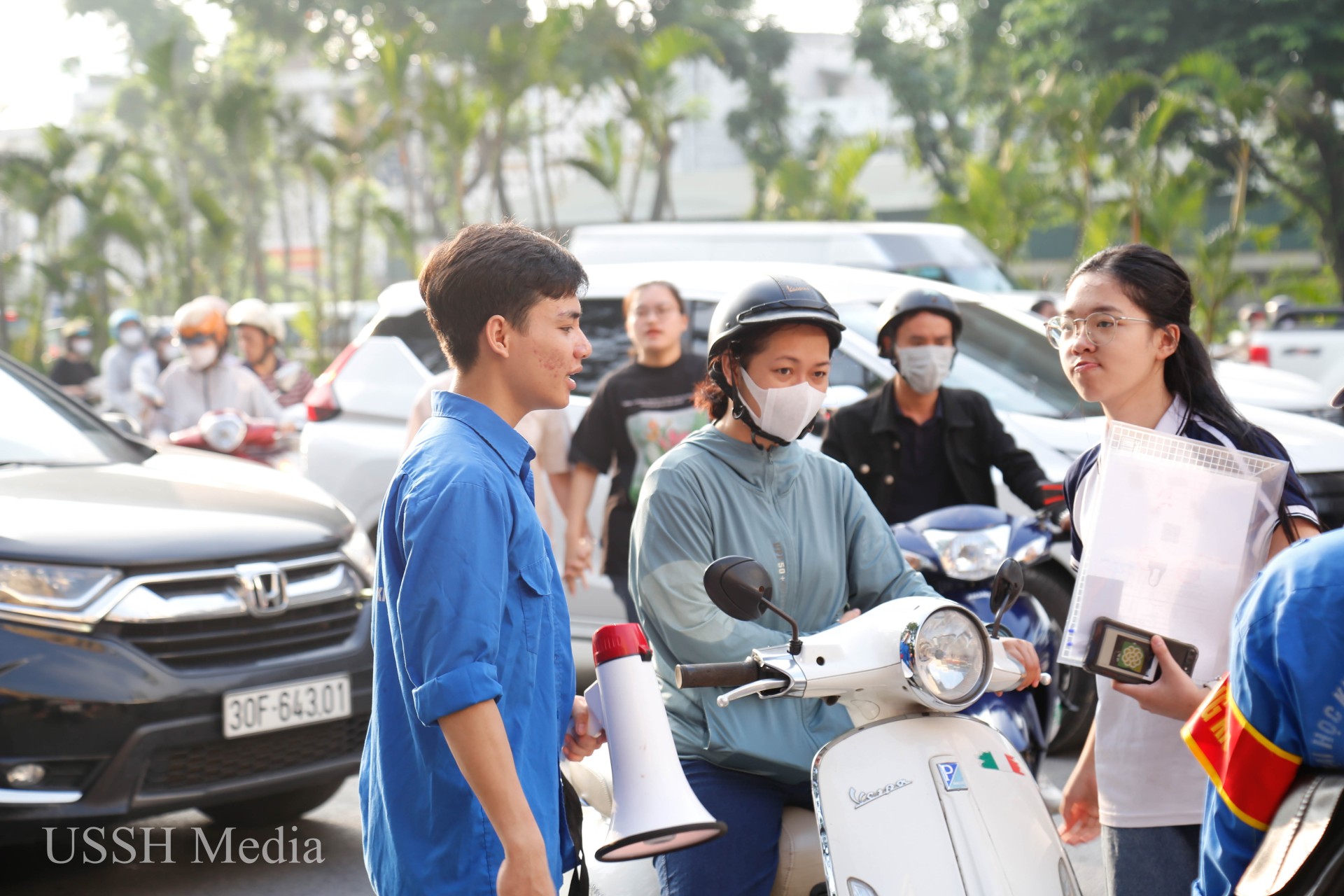 Từ 6h sáng, lực lượng tình nguyện viên tham gia phân luồng xe, hướng dẫn thí sinh và phụ huynh
