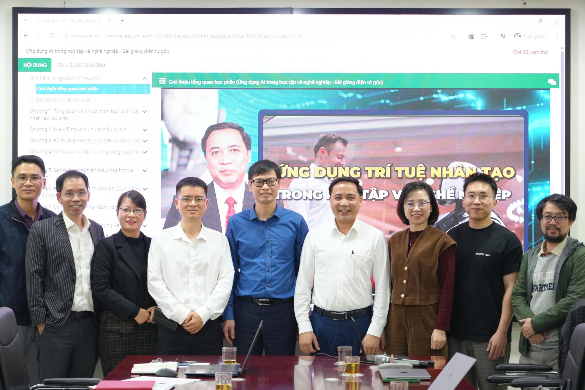 PGS.TS Đỗ Văn Hùng, Trưởng Khoa TT-TV, Trưởng nhóm biên soạn (áo trắng) báo cáo kết quả xây dựng bài giảng MOOC “Ứng dụng trí tuệ nhân tạo trong học tập và nghề nghiệp”