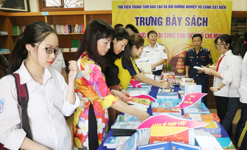 Trước buổi tọa đàm, các đại biểu đã tham quan gian trưng bày sách với chủ đề “50 năm thực hiện Di chúc của Chủ tịch Hồ Chí Minh” do thư viện Trung tâm Đào tạo và Bồi dưỡng Nghiệp vụ Cảnh sát biển tổ chức.