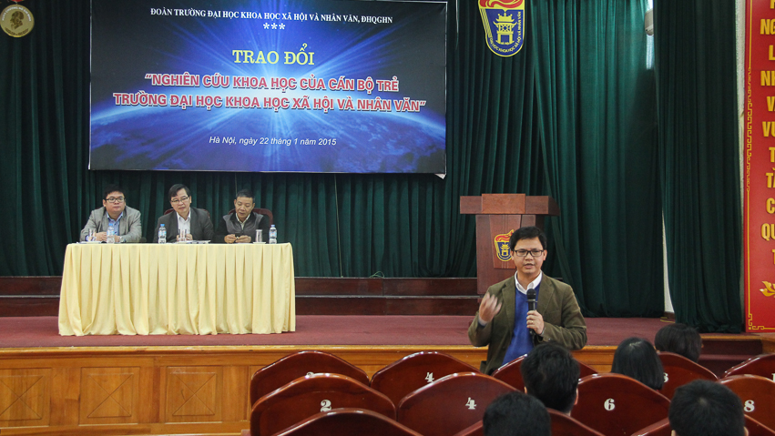 PGS.TS Vũ Văn Tích (Trưởng Ban Khoa học và Công nghệ, ĐHQGHN) đang chia sẻ ý kiến trao đổi về chủ đề nghiên cứu khoa học của cán bộ trẻ Trường ĐHKHXH&NV