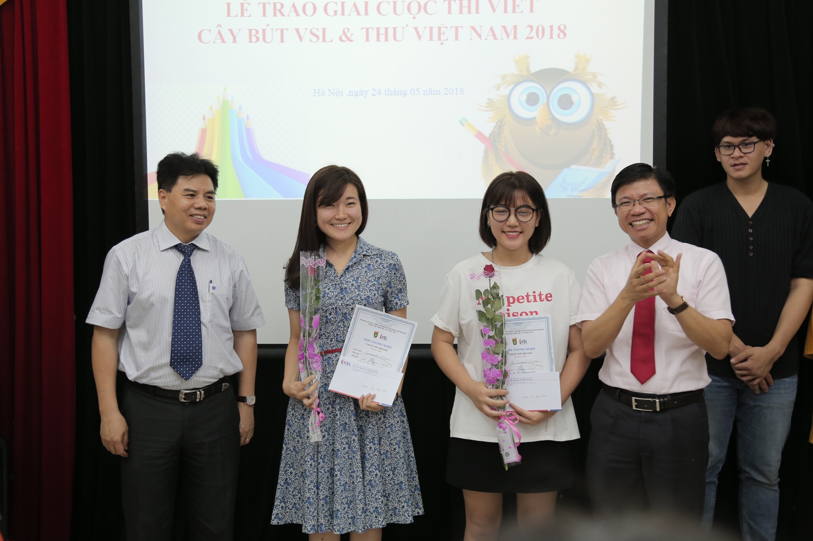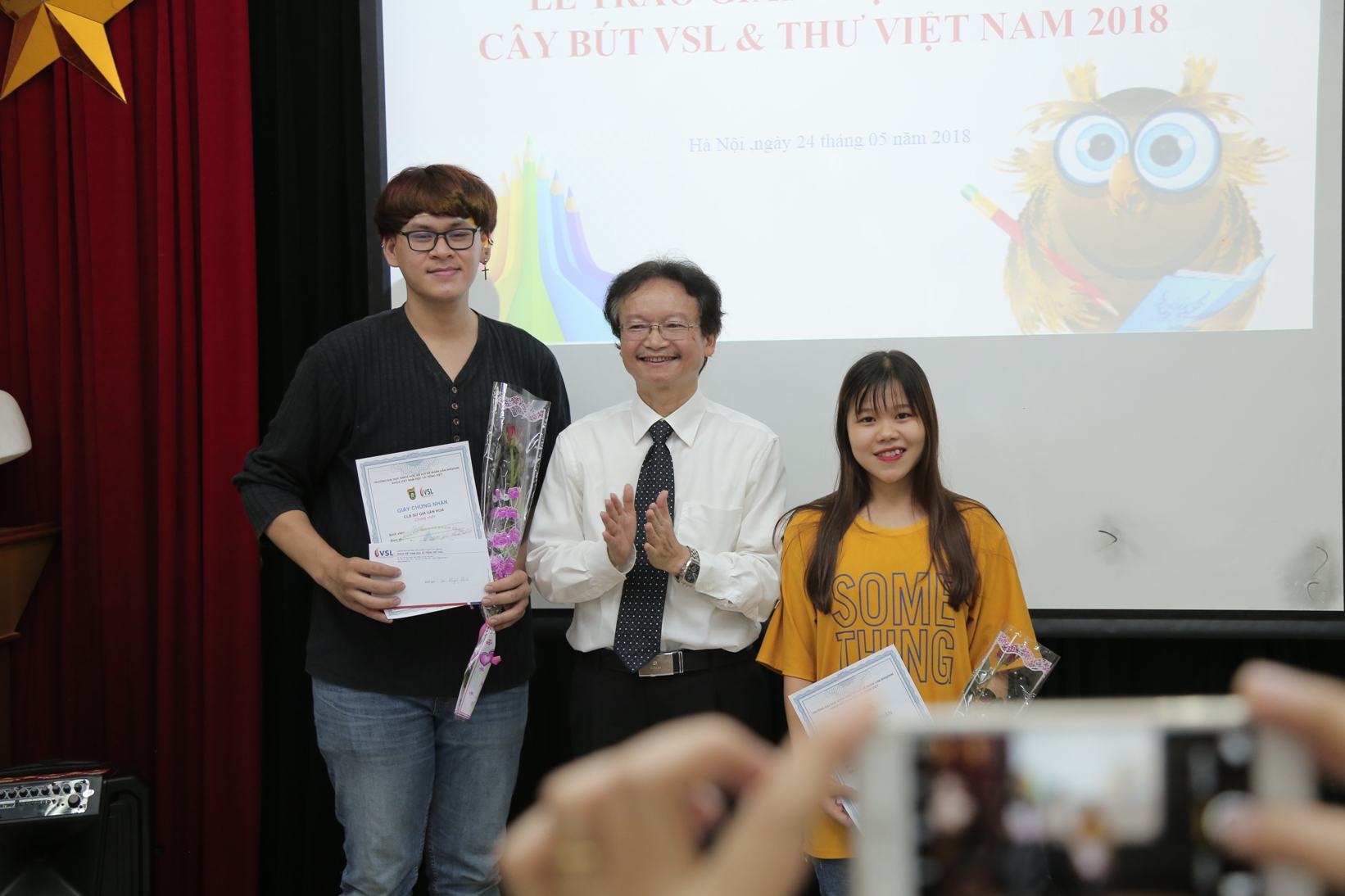 PGS.TS Hoàng Anh Tuấn và đại diện Quỹ Đào Minh Quang trao giải Nhất "Thư Việt Nam 2018" và giải Nhất "Cây bút VSL"