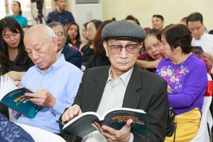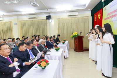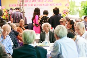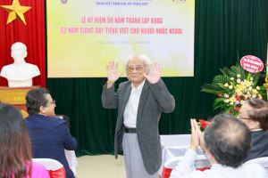 Các thầy cô vui mừng đón GS.NGND Hoàng Trọng Phiến - vị chủ nhiệm đầu tiên của Khoa Tiếng Việt