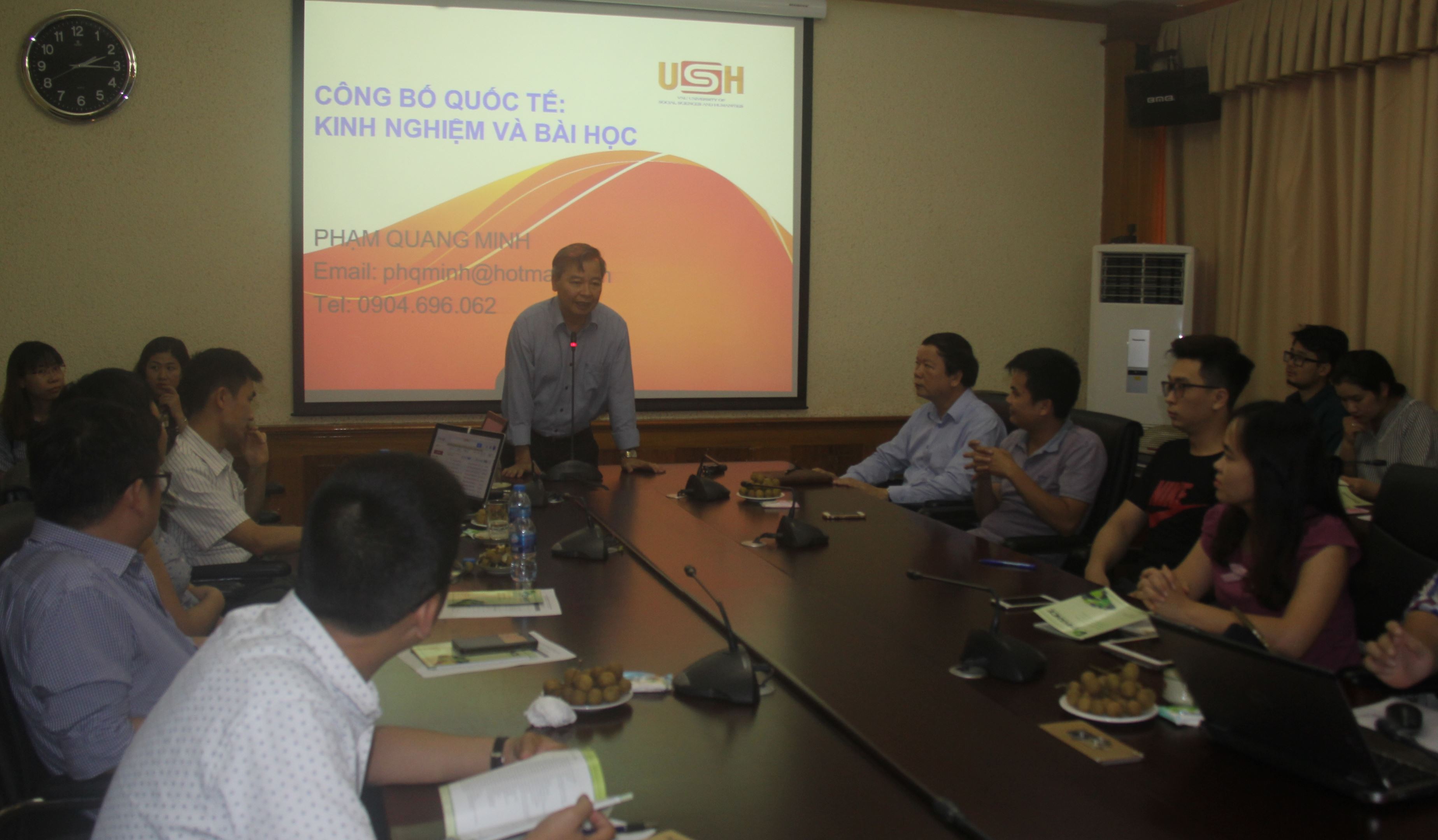 Tại toạ đàm, GS.TS Phạm Quang Minh nhấn mạnh rằng công bố quốc tế là con đường tất yếu để các nhà khoa học Việt Nam vươn lên hội nhập với khoa học thế giới. Đây còn là yêu cầu cấp thiết đối với các nhà nghiên cứu, bất kể là ở lĩnh vực khoa học nào. Giáo sư Hiệu trưởng cũng chỉ ra những khó khăn đang cản trở sự hội nhập của các nhà khoa học Việt Nam hiện nay, đó là rào cản về ngôn ngữ, thiếu thông tin khoa học, sự khác nhau về phương pháp luận nghiên cứu khoa học và đặc biệt là rào cản về nhận thức.