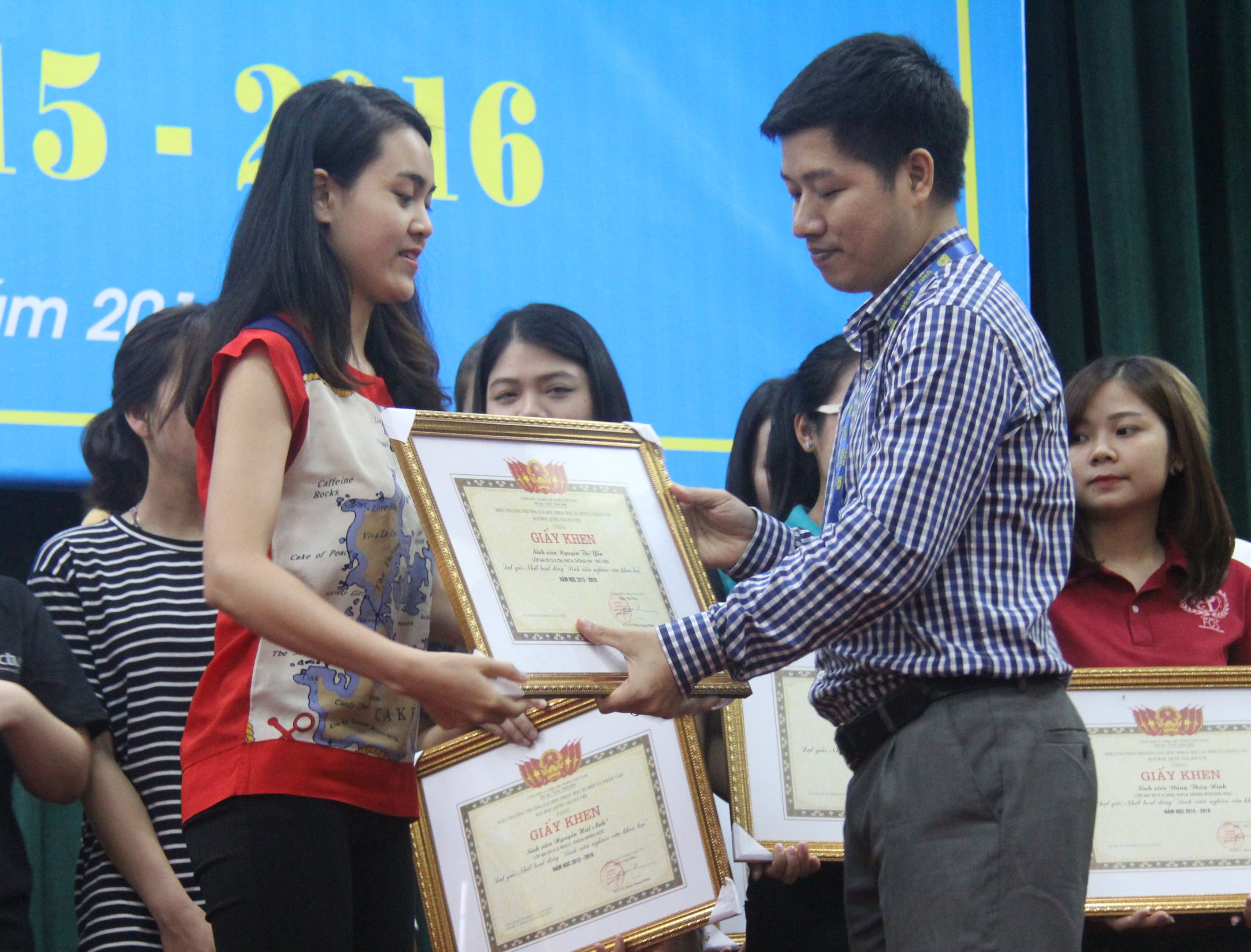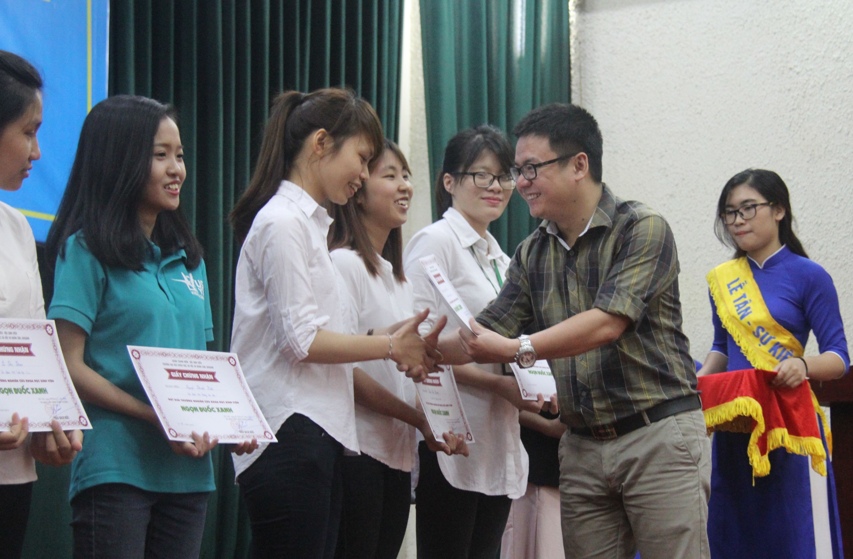 TS. Trần Bách Hiếu - Bí thư Đoàn Trường trao giấy khen của Đoàn trường cho các sinh viên được nhận giải thưởng Ngọn đuốc xanh