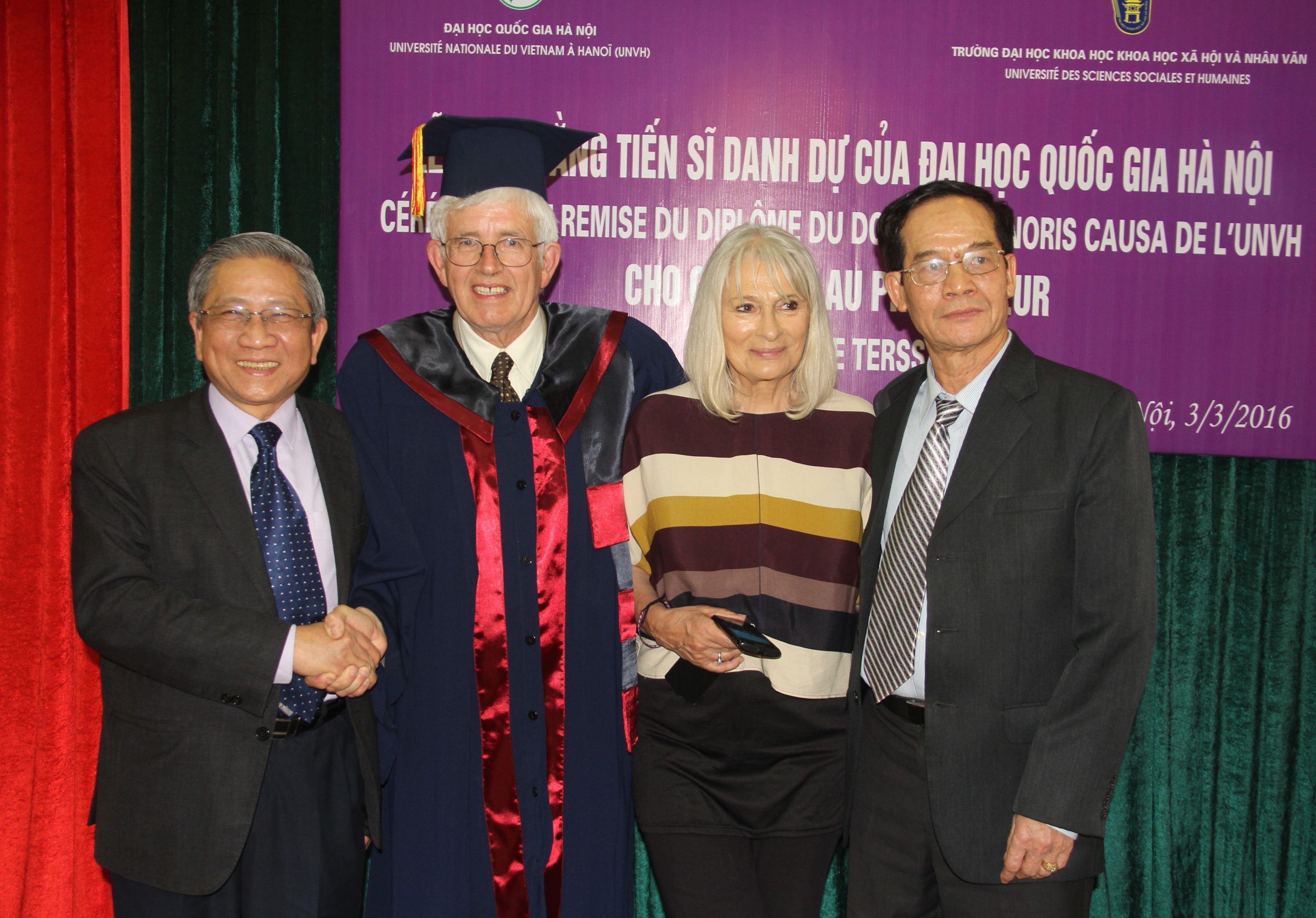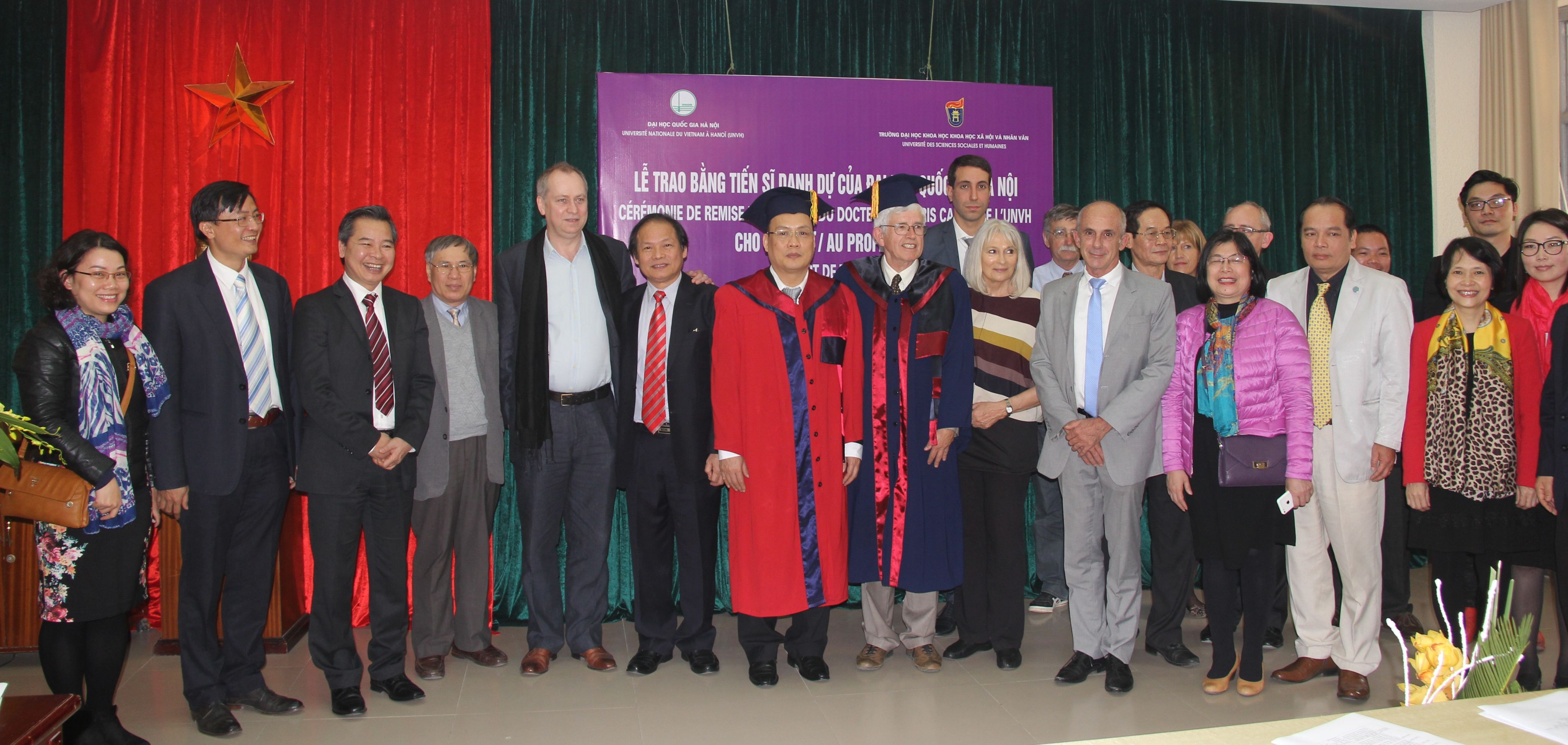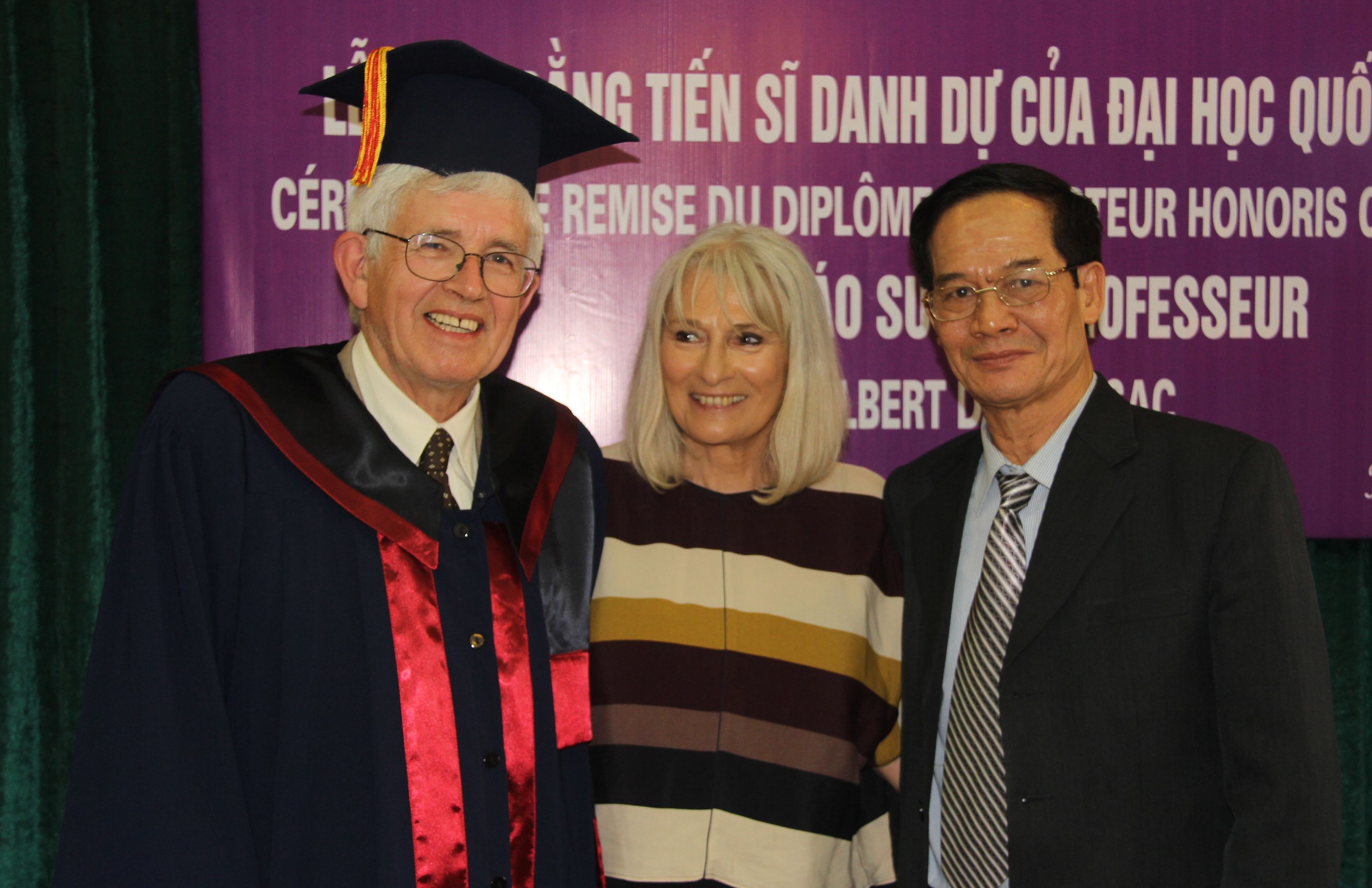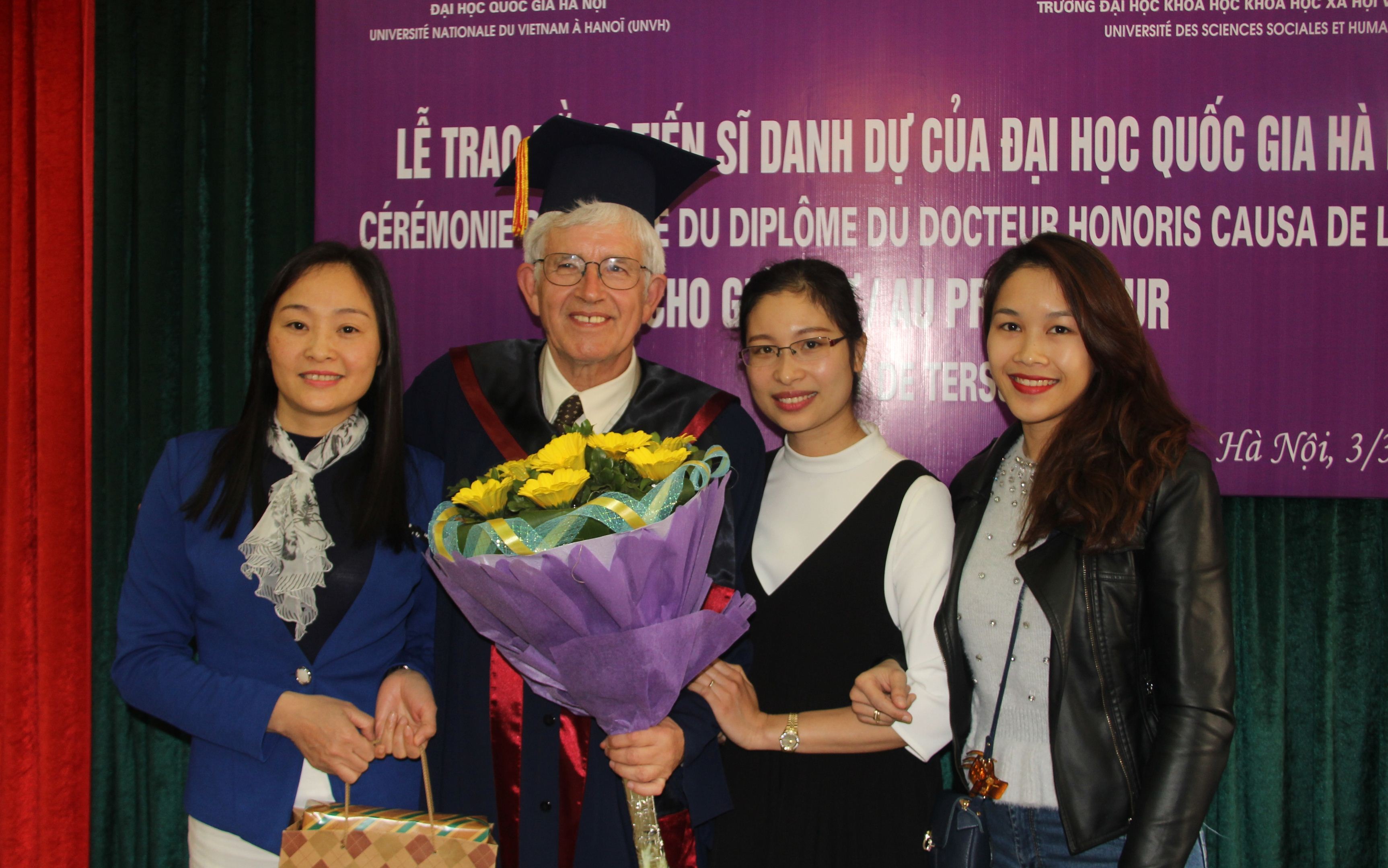 GS. Gilbert De Terssac bày tỏ niềm vui khi được nhận danh hiệu Tiến sĩ Danh dự do ĐHQGHN trao tặng. Sự kiện này có ý nghĩa lớn và sẽ giúp ông lưu giữ tình cảm với Việt Nam, vốn được nhen nhóm và thúc đẩy từ những năm 70 của thế kỷ trước.