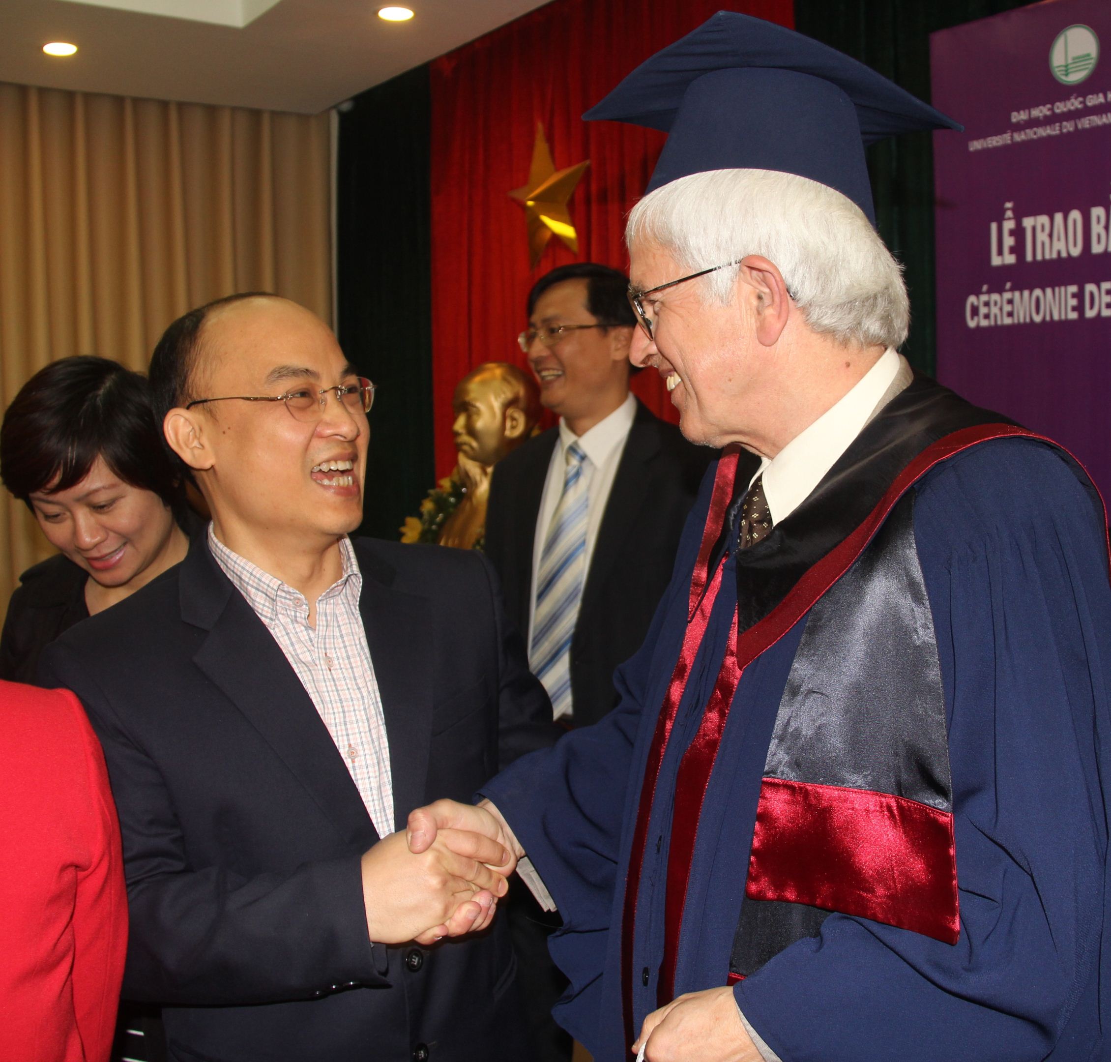 GS.TSKH Nguyễn Đình Đức - Trưởng ban Đào tạo ĐHQGHN trao bằng Tiến sĩ Danh dự của ĐHQGHN cho GS. Gilbert De Terssac vì những đóng góp xuất sắc của ông trong hoạt động khoa học và phát triển các mối quan hệ hợp tác hữu nghị với ĐHQGHN