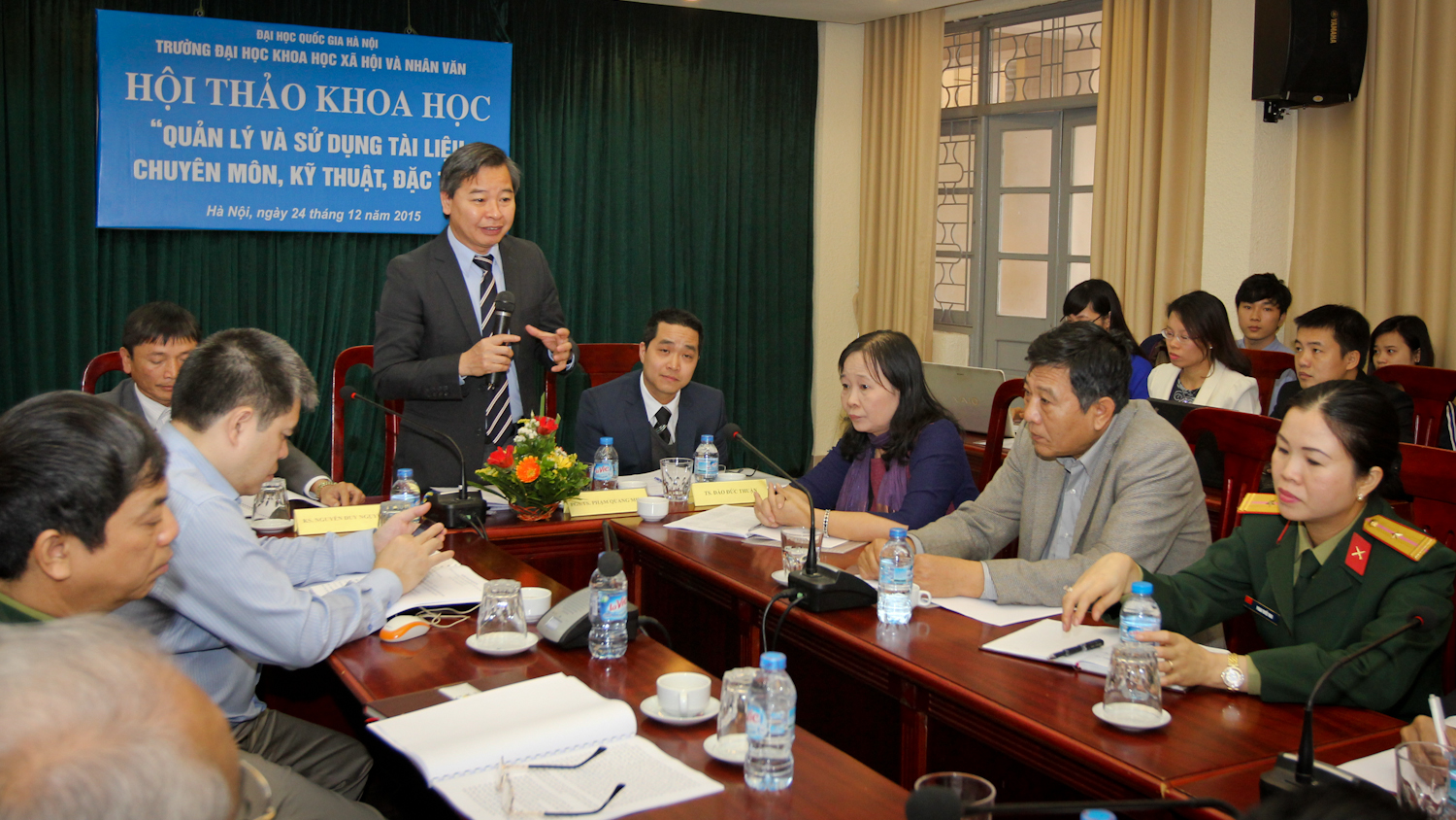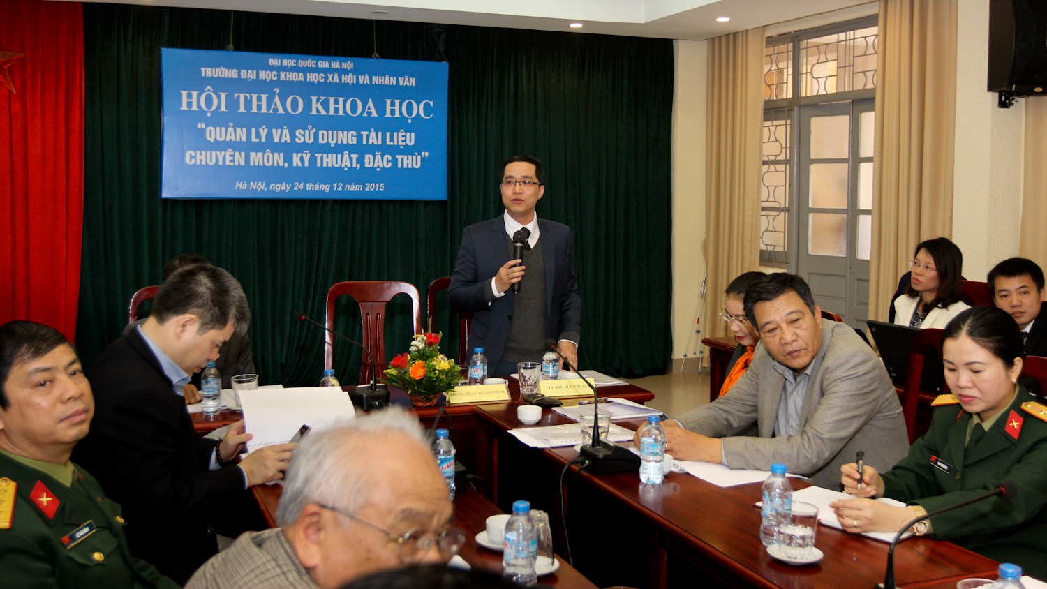 Tới tham dự hội thảo có PGS.TS Phạm Quang Minh, Phó Hiệu trưởng Trường Trường ĐHKHXH&NV, ĐHQGHN; TS. Đào Đức Thuận, Chủ nhiệm Khoa LTH&QTVP; PGS.TS Vũ Thị Phụng, Chủ tịch Hội đồng Khoa học Khoa LTH&QTVP cùng đại diện các cơ quan của Bộ Ngoại Giao, Bộ Công An, Ngân hàng Nhà nước Việt Nam, Cục Văn thư Lưu trữ Nhà nước, Cục hồ sơ nghiệp vụ Cảnh sát, Cục hồ sơ nghiệp vụ An Ninh; Trung tâm Lưu trữ dầu khí,…các giảng viên, học viên cao học và nghiên cứu sinh của Khoa LTH&QTVP.