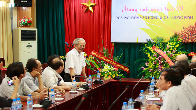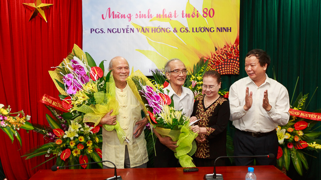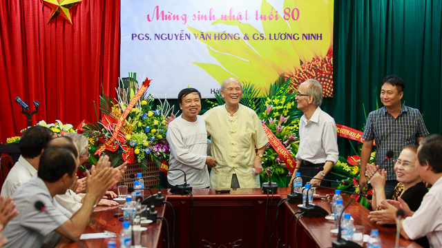 PGS. Nguyễn Văn Hồng và GS. Lương Ninh nhận lời chúc mừng của học trò là PGS.TS Tống Trung Tín (Viện Khảo cổ học) (Ảnh: Thành Long)