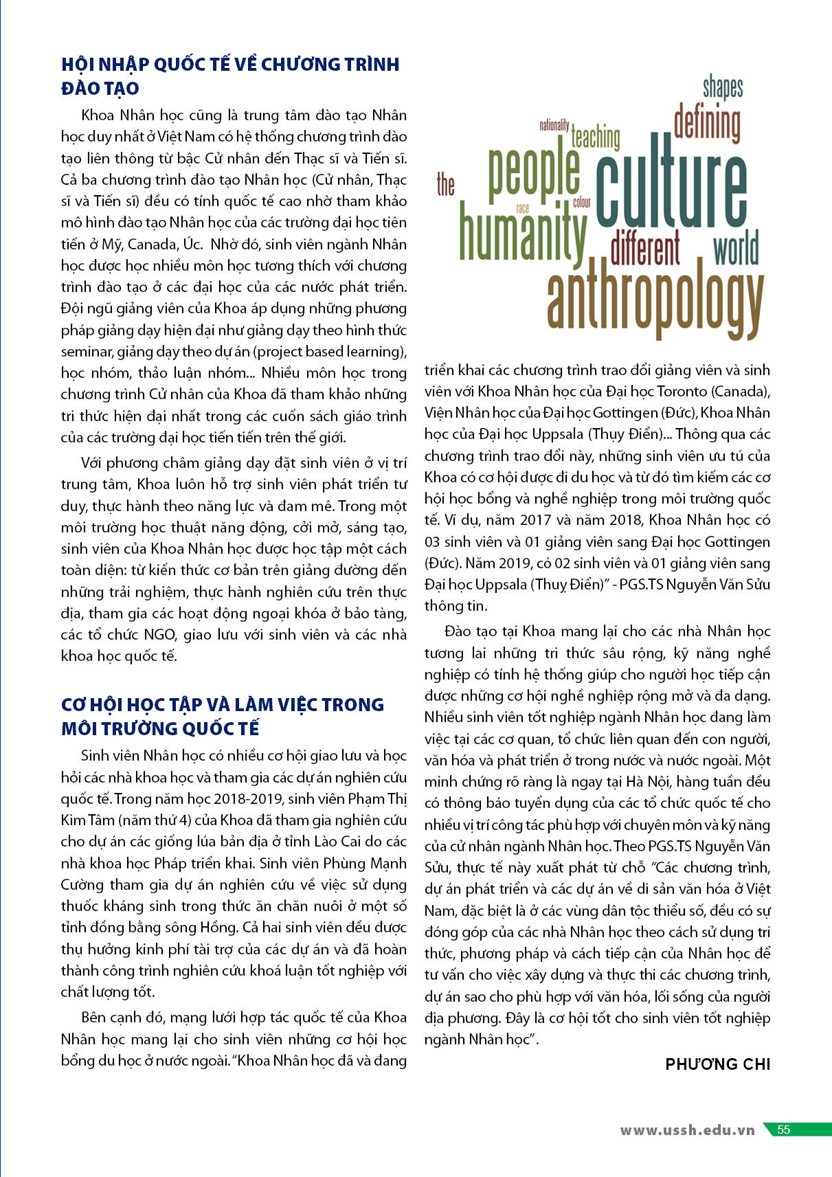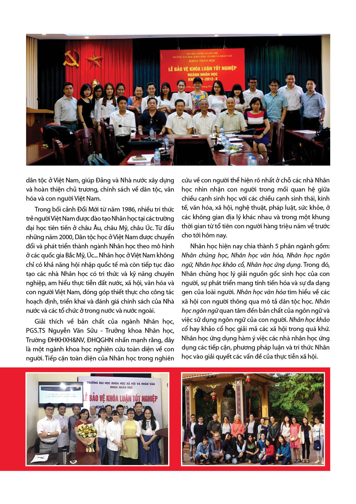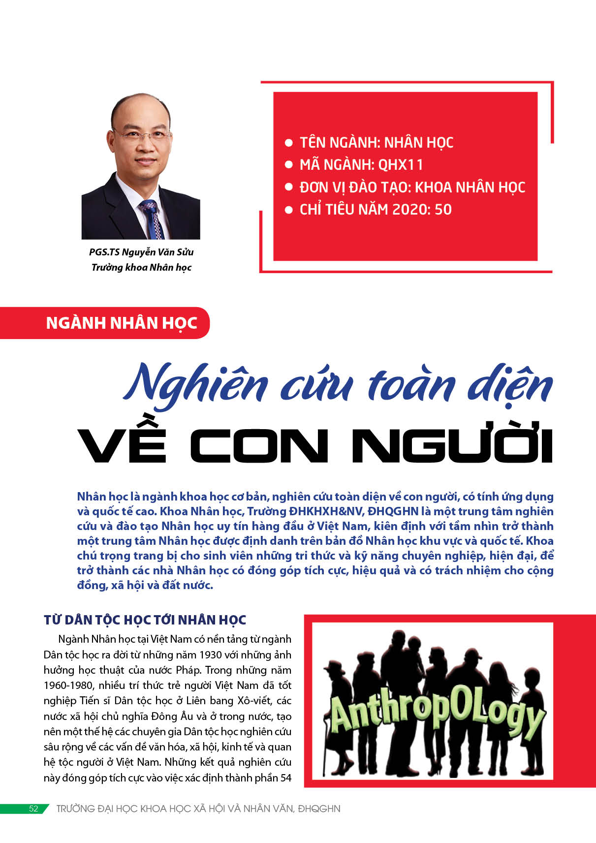Nhân học là ngành khoa học cơ bản, nghiên cứu toàn diện về con người, có tính ứng dụng và quốc tế cao. Khoa Nhân học, Trường ĐHKHXH&NV, ĐHQGHN là một trung tâm nghiên cứu và đào tạo Nhân học uy tín hàng đầu ở Việt Nam, kiên định với tầm nhìn trở thành một trung tâm Nhân học được định danh trên bản đồ Nhân học khu vực và quốc tế. Khoa chú trọng trang bị cho sinh viên tri thức và kỹ năng chuyên nghiệp, hiện đại để trở thành những nhà Nhân học có đóng góp tích cực, hiệu quả và có trách nhiệm cho cộng đồng, xã hội và đất nước.