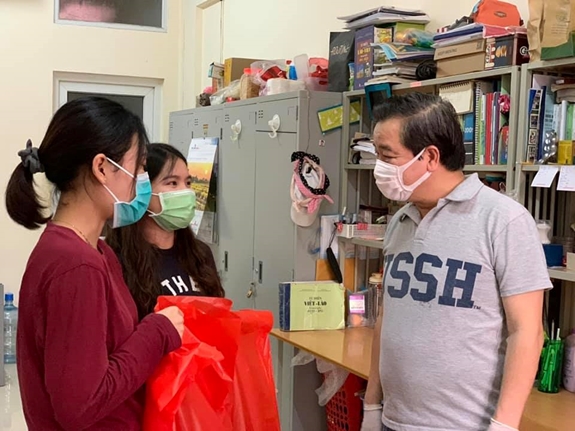 Giáo sư, tiến sĩ Phạm Quang Minh gửi nhu yếu phẩm tới sinh viên trong ký túc xá. Ảnh: THANH HÀ