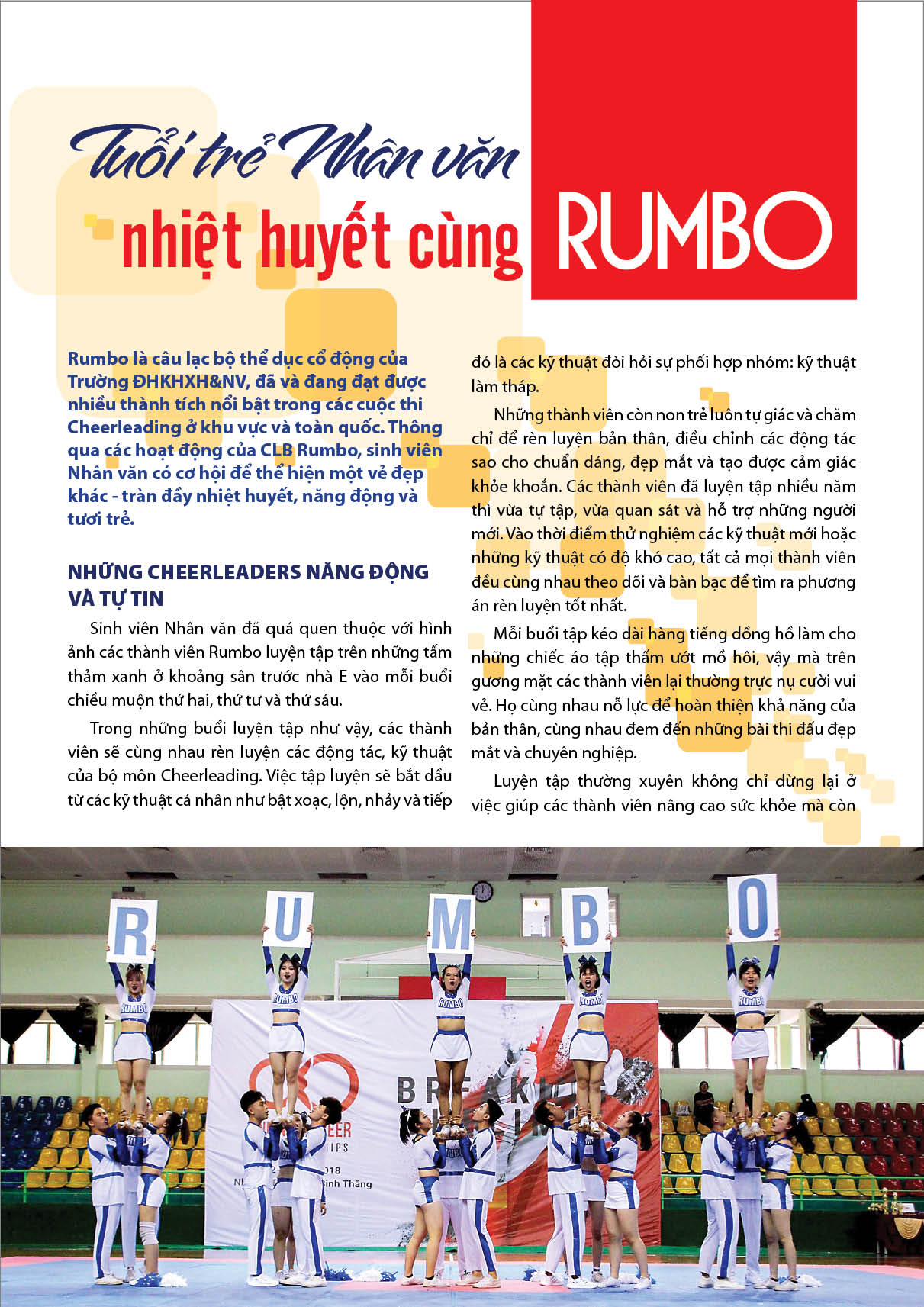 Rumbo là câu lạc bộ thể dục cổ động của sinh viên Trường Đại học Khoa học Xã hội và Nhân văn, đã và đang đạt được nhiều thành tích nổi bật trong các cuộc thi Cheerleading ở khu vực và toàn quốc.