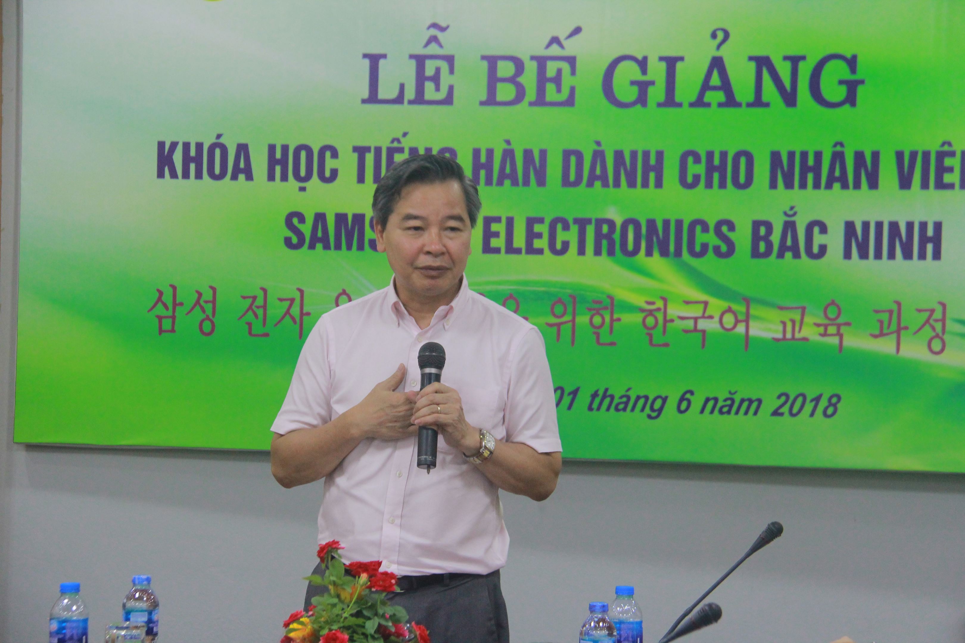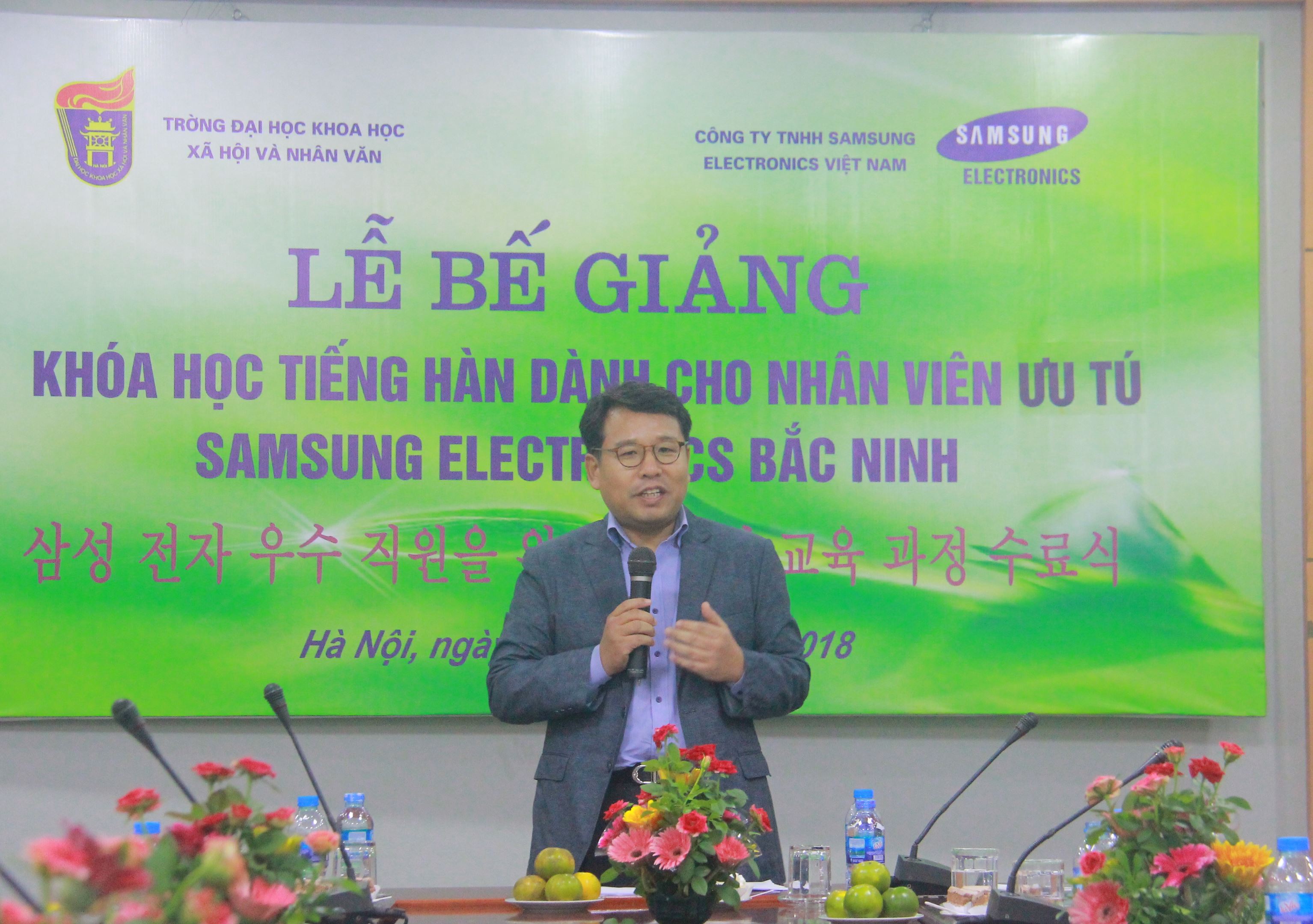 Phát biểu tại buổi lễ bế giảng, GS.TS Phạm Quang Minh (Hiệu trưởng ĐHKHXH&NV) chúc mừng những nhân viên ưu tú của công ty Samsung đã hoàn thành xuất sắc khóa học tại trường. GS mong rằng với những kiến thức về ngôn ngữ và văn hóa Hàn Quốc được cung cấp tại khóa học, các học viên sẽ có tiến bộ vượt bậc và có cơ hội nghề nghiệp tốt hơn trong tương lai. Từ những trải nghiệm của mình, GSi Hiệu trưởng cũng bày tỏ niềm tin vào mối quan hệ tốt đẹp giữa Trường ĐHKHXH&NV với Công ty Samsung nói riêng, và mối quan hệ Việt Nam - Hàn Quốc nói chung.