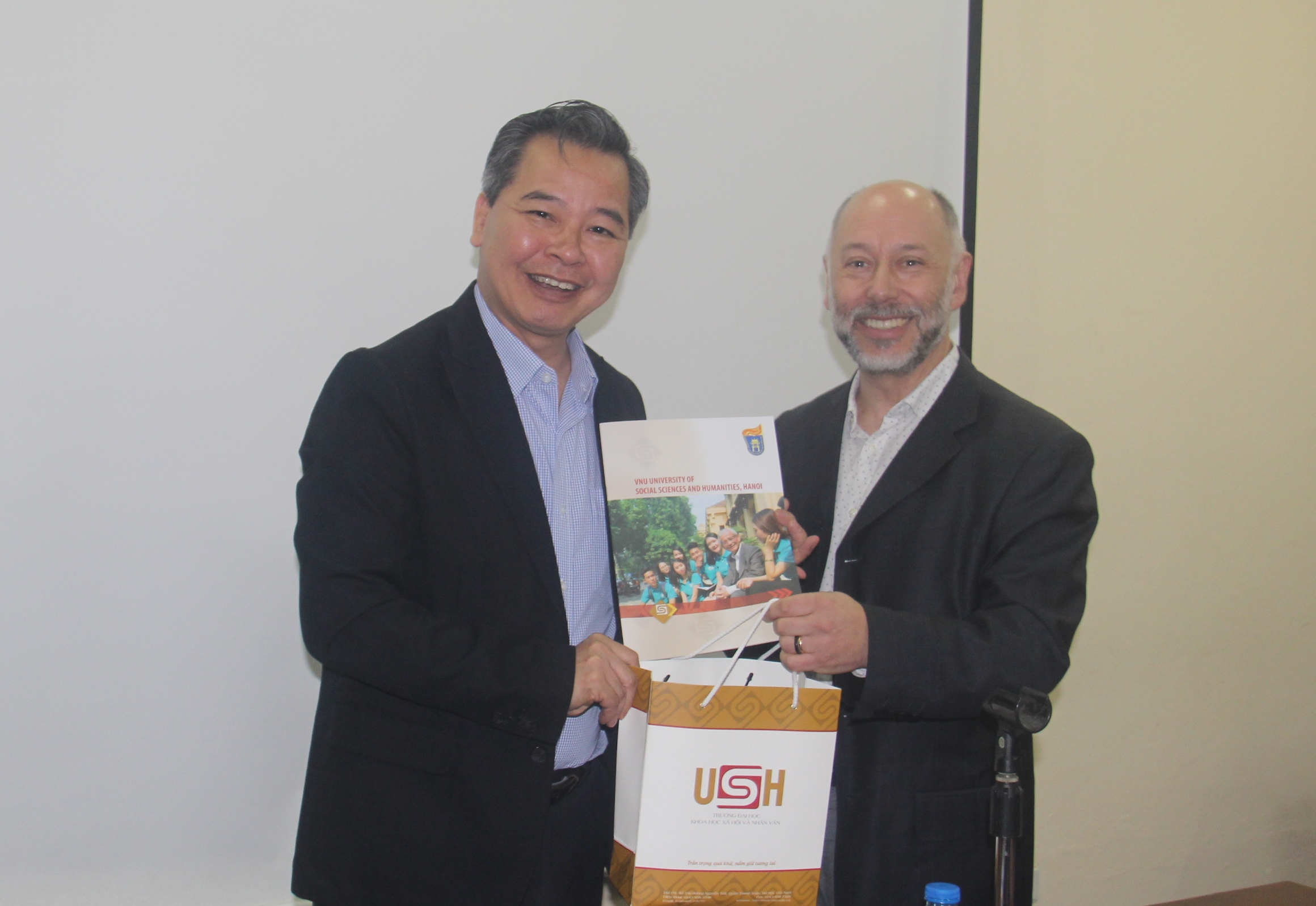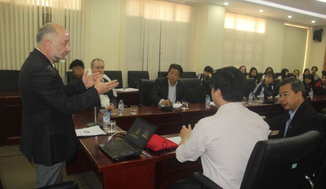 Tham dự buổi thuyết trình có GS.TS Phạm Quang Minh (Hiệu trường Nhà trường), GS.TS Nguyễn Văn Kim (Phó Hiệu trưởng Nhà trường), TS. Andrew Hardy (Giám đốc Viện Viễn đông bác cổ) cùng nhiều nhà khoa học và sinh viên trong trường.