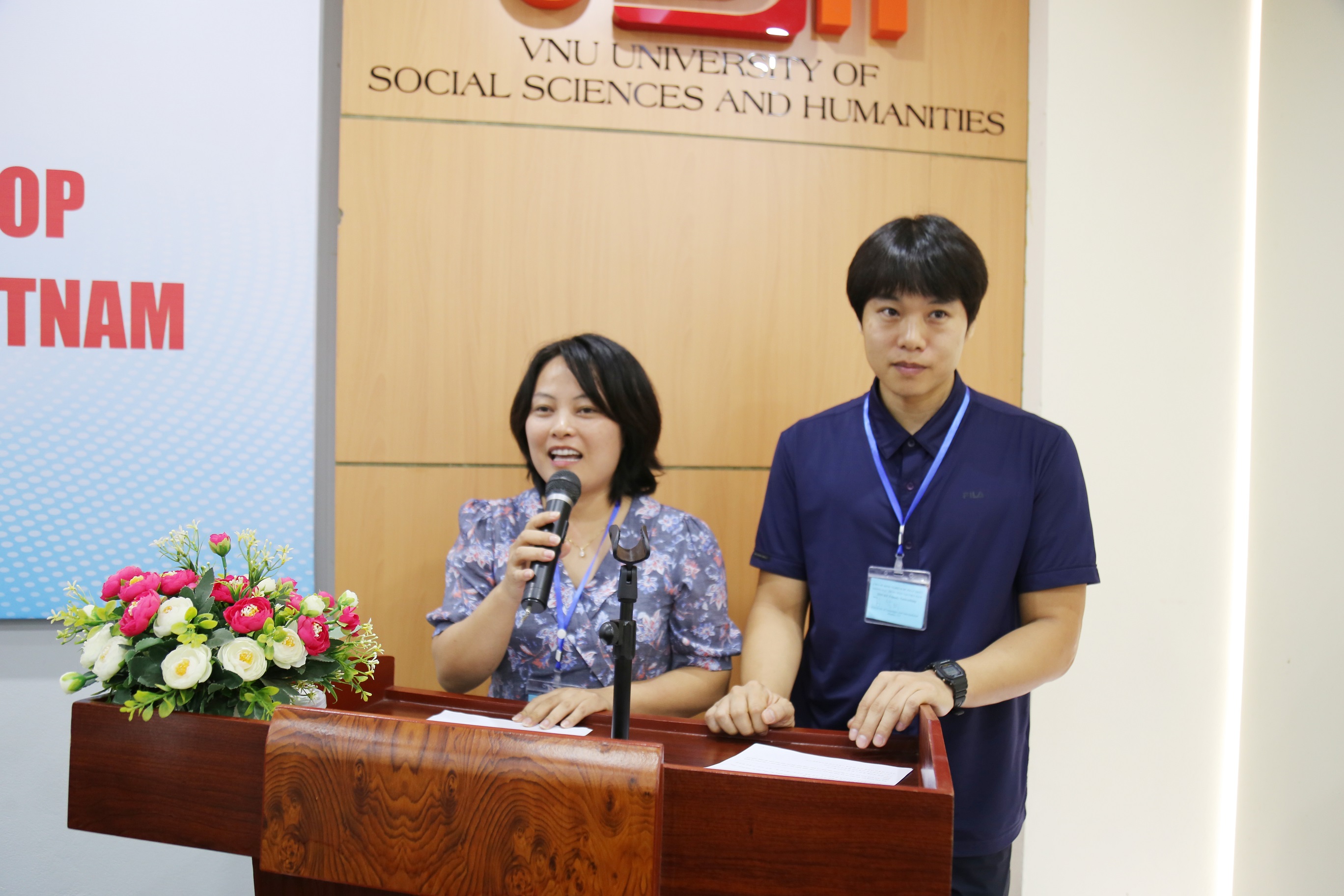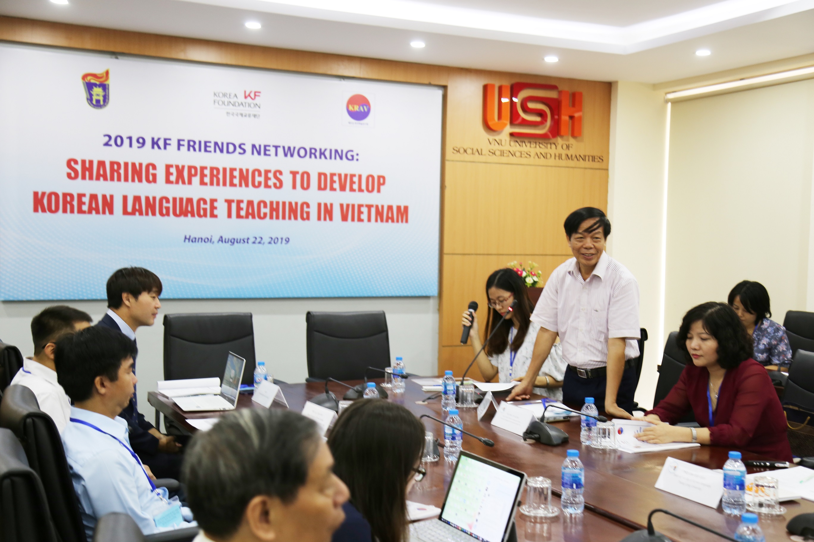 Ông Woo Huyn-min (Trưởng đại diện Quỹ giao lưu Quốc tế Hàn Quốc - KF) phát biểu: Việt Nam và Hàn Quốc thiết lập quan hệ ngoại giao đã lâu và đã cùng nhau tổ chức nhiều sự kiện liên quan tới Hàn Quốc. Trước đây, các hội thảo, tọa đàm, workshop chủ yếu bàn về nghiên cứu Hàn Quốc học ở các lĩnh vực cụ thể. Sự kiện lần này do Khoa Đông phương học, Trường ĐHKHXHNV, ĐHQGHN tổ chức mang một ý nghĩa khác khi hướng tới việc giao lưu, chia sẻ kinh nghiệm giảng dạy tiếng Hàn trong đội ngũ giảng viên tại Việt Nam. Các giảng viên giảng dạy tiếng Hàn sẽ có cơ hội giao lưu và học tập kinh nghiệm từ các đồng nghiệp đến từ các trường đại học khác. Mong rằng các thầy cô giảng dạy tiếng Hàn lâu năm sẽ chia sẻ các kinh nghiệm quí của mình và các bạn giảng viên trẻ sẽ mở lòng và tích cực thu nhận các phương pháp giảng dạy mới, học hỏi những người đi trước để nâng cao phương pháp giảng dạy cho chính mình.
