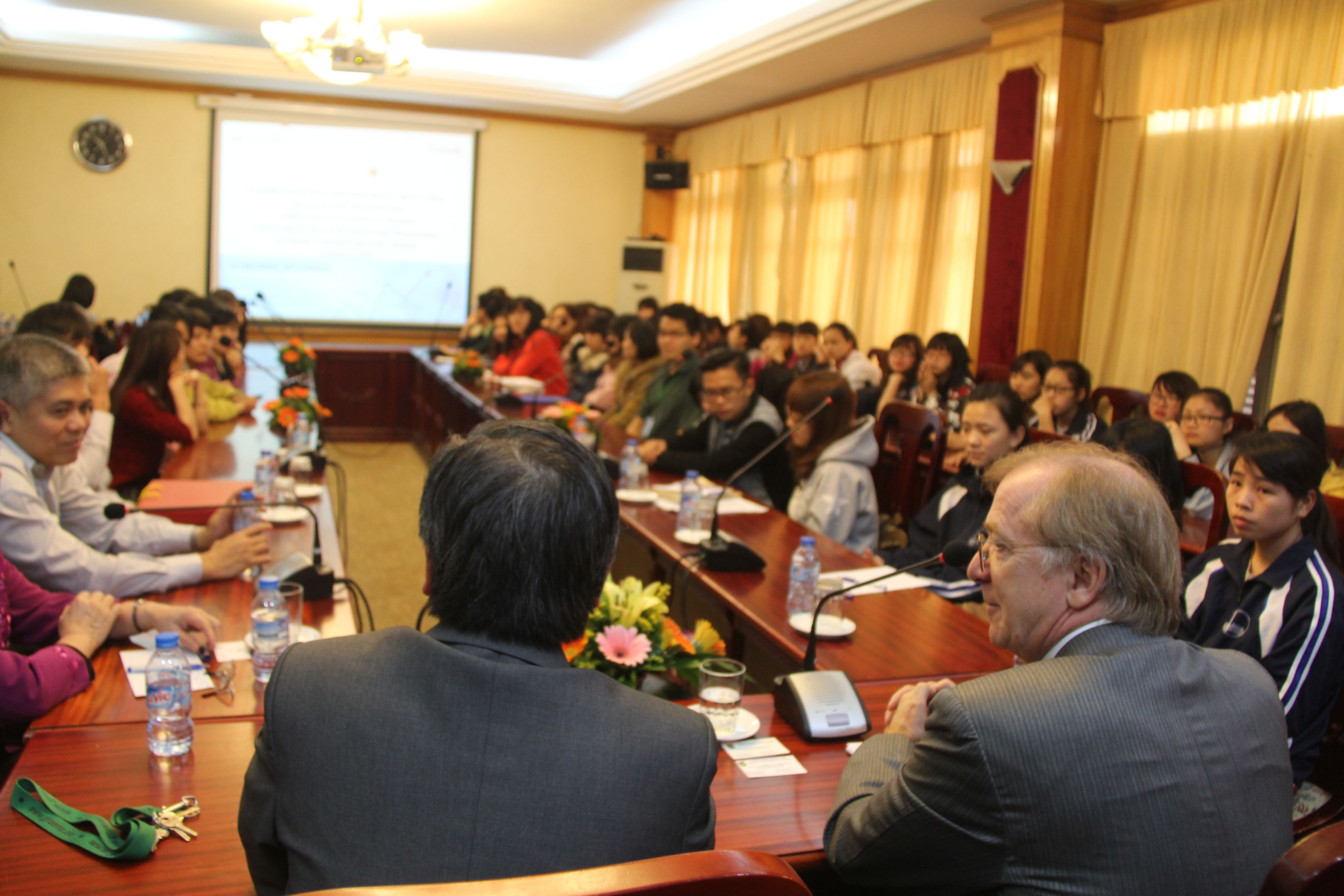 Sau bài thuyết trình, các sinh viên khoa Quốc tế học đã trao đổi với Đại sứ H.E. David Devine về nhiều vấn đề liên quan tới phụ nữ và quyền phụ nữ như chế độ bảo vệ người phụ nữ ở Canada chống lại nạn bạo hành gia đình và phân biệt đối xử, những chính sách hỗ trợ cho cộng đồng LGBT ở Canada, những bước đi để thúc đẩy quyền phụ nữ hiện nay và triển vọng trong tương lai, vai trò khác biệt giữa phụ nữ thời hiện đại và phong kiến cũng như giữa phụ nữ thành thị và nông thôn…