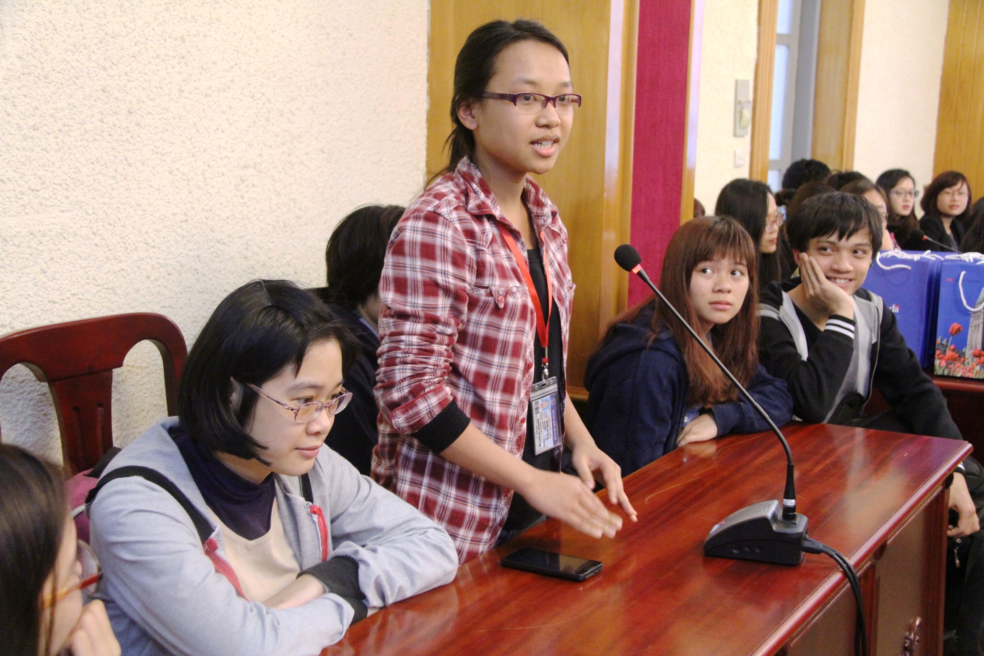 Bạn Nguyễn Thu Hà (K57, Quốc tế học) đặt câu hỏi cho Đại sứ H.E. David Devine (Ảnh: Trần Minh)