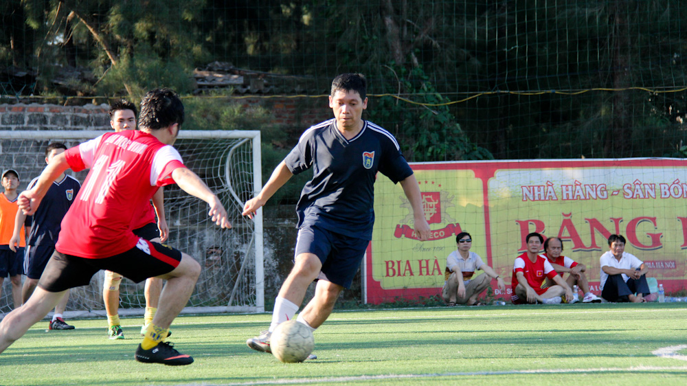 Thầy Tuấn Anh đang dẫn bóng vượt qua cầu thủ đội ĐH Vinh