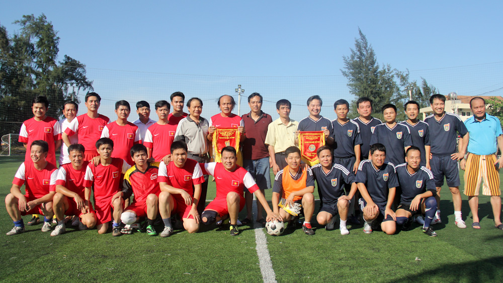 Lãnh đạo hai Nhà trường trao cờ lưu niệm và chụp ảnh cùng hai đội bóng trước giờ thi đấu