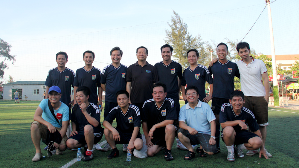 PGS.TS Nguyễn Văn Kim chụp ảnh lưu niệm cùng các thành viên của đội bóng khi kết thúc trận.