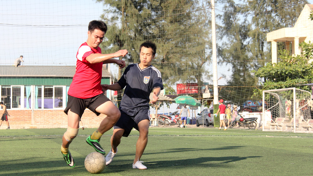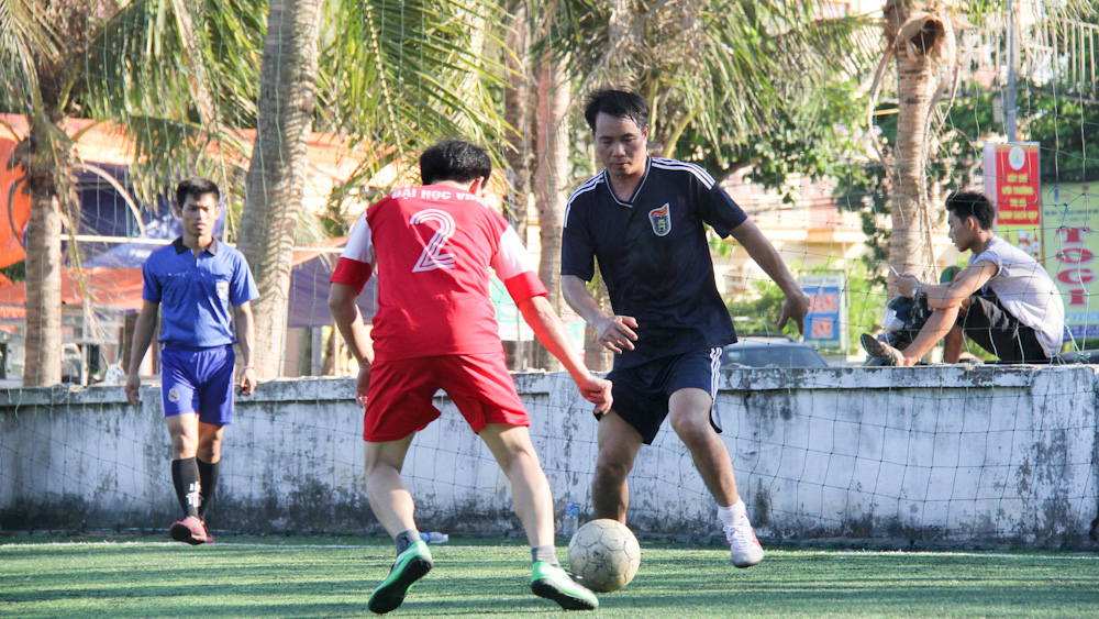 Thầy Tuấn Hùng - Phó Chủ nhiệm Khoa Lưu trữ học và Quản trị văn phòng đang tranh bóng với cầu thủ ĐH Vinh