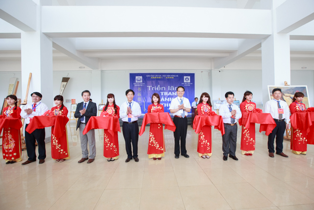 Đại diện lãnh đạo các đoàn cắt băng khai mạc tranh - ảnh - thư pháp.