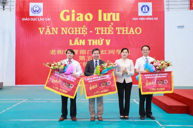Đồng chí Hà Thị Nga (Phó Chủ tịch UBND tỉnh Lào Cai) tặng hoa và cờ lưu niệm cho đại diện các đoàn. Từ trái sang: ông Hoàng Văn Dương (Phó GĐ Sở GD&ĐT Lào Cai), PGS.TS Phạm Quang Minh (Phó Hiệu trưởng Trường ĐHKHXH&NV), ông La Gia Cường (Phó Bí thư Đảng uỷ HV Hồng Hà - Trung Quốc).