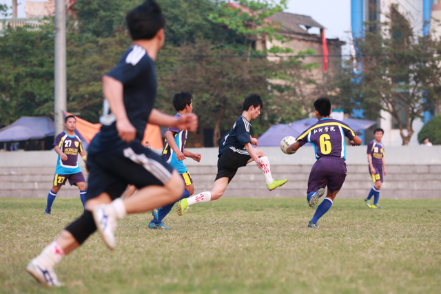 Một tình huống phòng ngự của đội trường ĐHKHXH&NV (áo xanh đen) trong trận đấu với đội Giáo dục Lào Cai.