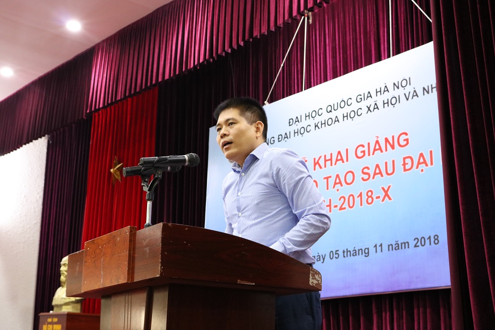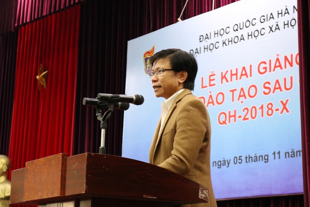 Phát biểu tại buổi lễ, Phó Hiệu trưởng Hoàng Anh Tuấn gửi lời chúc nồng nhiệt tới các tân NCS và HVCH khóa QH-2018-X. Thầy cho biết: Trường ĐHKHXH&NV hiện có hơn 70 chương trình sau đại học với các ngành/chuyên ngành đa dạng, đảm bảo cơ cấu và tương thích với nhu cầu trong nước cũng như xu hướng trên thế giới. Trong những năm qua, Nhà trường đã điều chỉnh tiến trình đào tạo, cách thức tổ chức các môn học, quy trình làm hồ sơ bảo vệ, nhằm tạo điều kiện cho quá trình học của HVCH và NCS linh hoạt, hiệu quả hơn. Phó Hiệu trưởng cũng đề nghị các đơn vị đào tạo bám sát quy trình đào tạo, nêu cao tinh thần phục vụ và đổi mới trong đào tạo sau đại học.