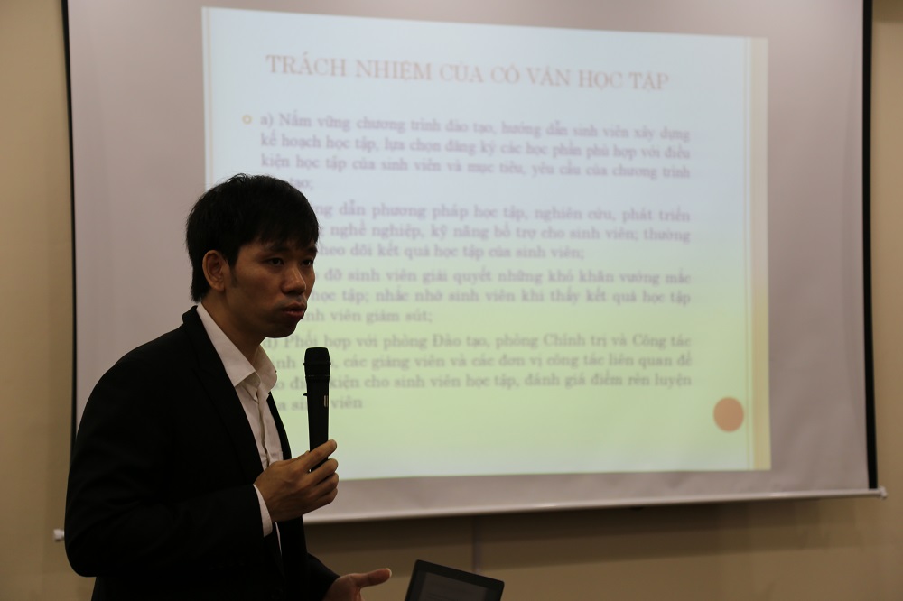 Tiếp đó, các giảng viên tham gia khóa tập huấn đã lắng nghe ThS. Đào Minh Quân trình bày các nội dung như quy định mới của ĐHQGHN về công tác cố vấn học tập, các tiêu chí cần thiết của cố vấn học tập, quy trình nghiệp vụ của cố vấn học tập, trách nhiệm và quyền lợi của cố vấn học tập.