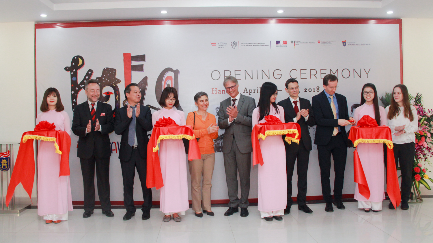 Hiệu trưởng Phạm Quang Minh cùng Đại sứ 5 nước Áo, Cộng hòa Séc, Đức, Pháp, Thụy Sĩ tại Việt Nam cắt băng khai trương triển lãm
