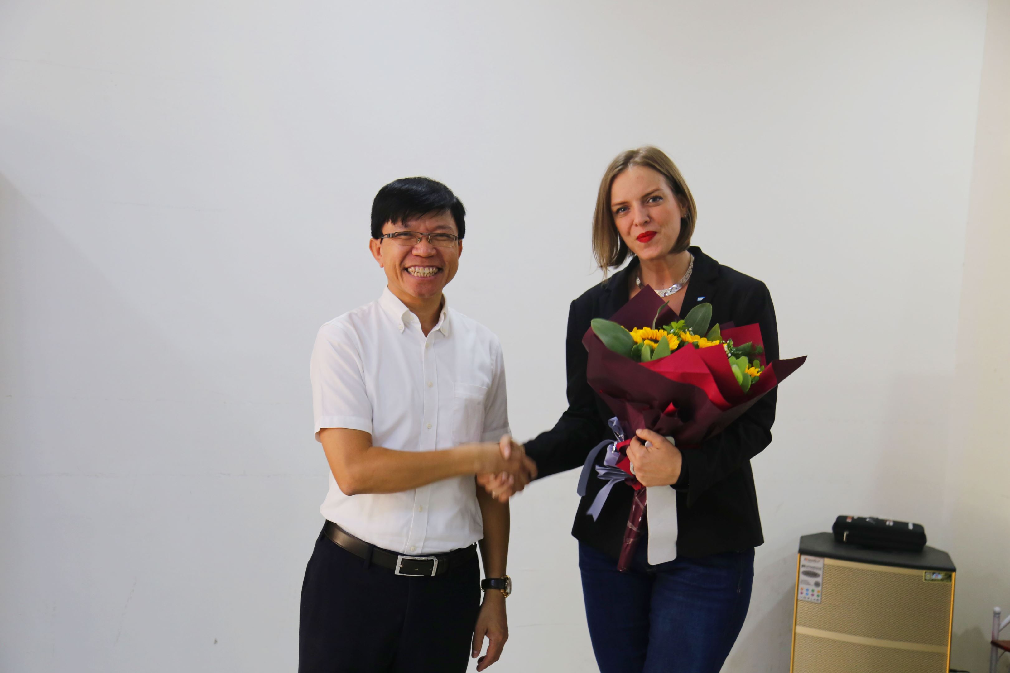 Phó Hiệu trưởng Hoàng Anh Tuấn tặng hoa cảm ơn các giảng viên tham gia khoá học