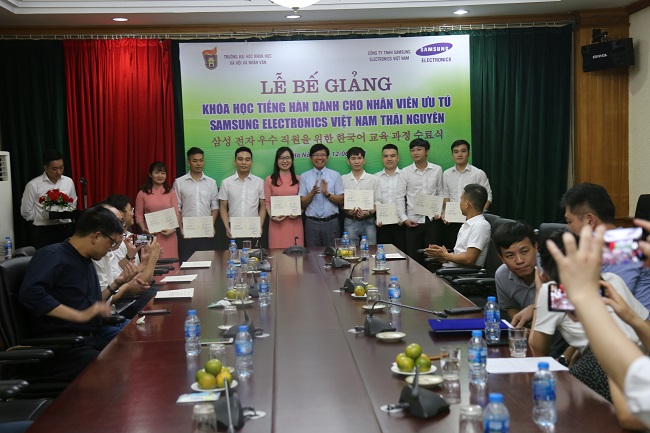 Tham dự buổi lễ bế giảng, về phía Trường ĐHKHXH&NV có PGS.TS Hoàng Anh Tuấn (Phó Hiệu trưởng Nhà trường), các thầy cô giáo Bộ môn Hàn Quốc học, Khoa Đông phương học; về phía Samsung Electronics Việt Nam-Thái Nguyên có ông Bae IL Hwan (Phó Tổng giám đốc).