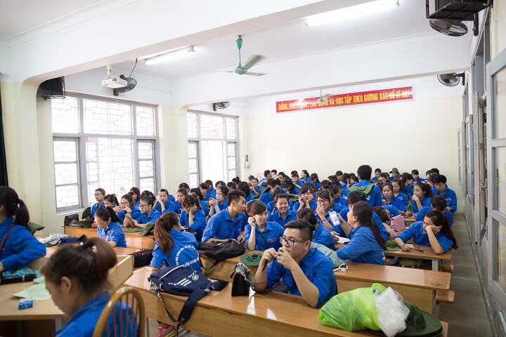 Sinh viên xung kích tập trung trong hội trường (Ảnh: Ngọc Quân)