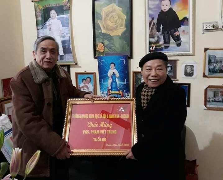 Thừa ủy quyền của Đảng ủy, Ban Giám hiệu và Công đoàn Nhà trường, GS.NGND Vũ Dương Ninh đã tặng bức tranh thêu và quà mừng thọ PGS. Phạm Việt Trung tuổi 85. GS.TS.Hoàng Khắc Nam (Trưởng Khoa Quốc tế học) cũng gửi tặng quà và thiệp chúc mừng năm mới của cán bộ Khoa tới thầy. Tại buổi gặp mặt, PGS. Phạm Việt Trung cùng các thầy, cô đã ôn lại nhiều kỉ niệm và cập nhật thêm các thông tin mới cũng như tình hình phát triển của Khoa và Nhà trường.