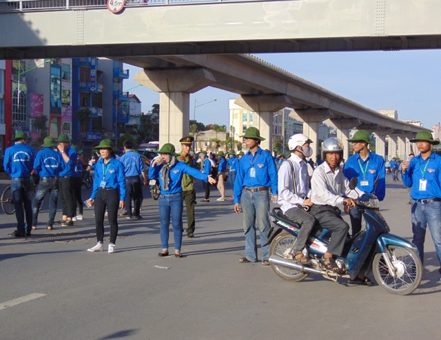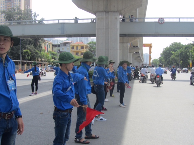 Đội tình nguyện Nhân Văn điều phối giao thông ngoài đường Nguyễn Trãi (Ảnh: Phạm Thanh Tùng)