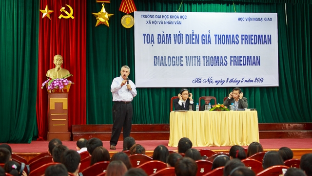 Nhà báo Thomas Friedman có lối thuyết trình hấp dẫn, lôi cuốn và gần gũi (Ảnh: Thành Long/USSH)