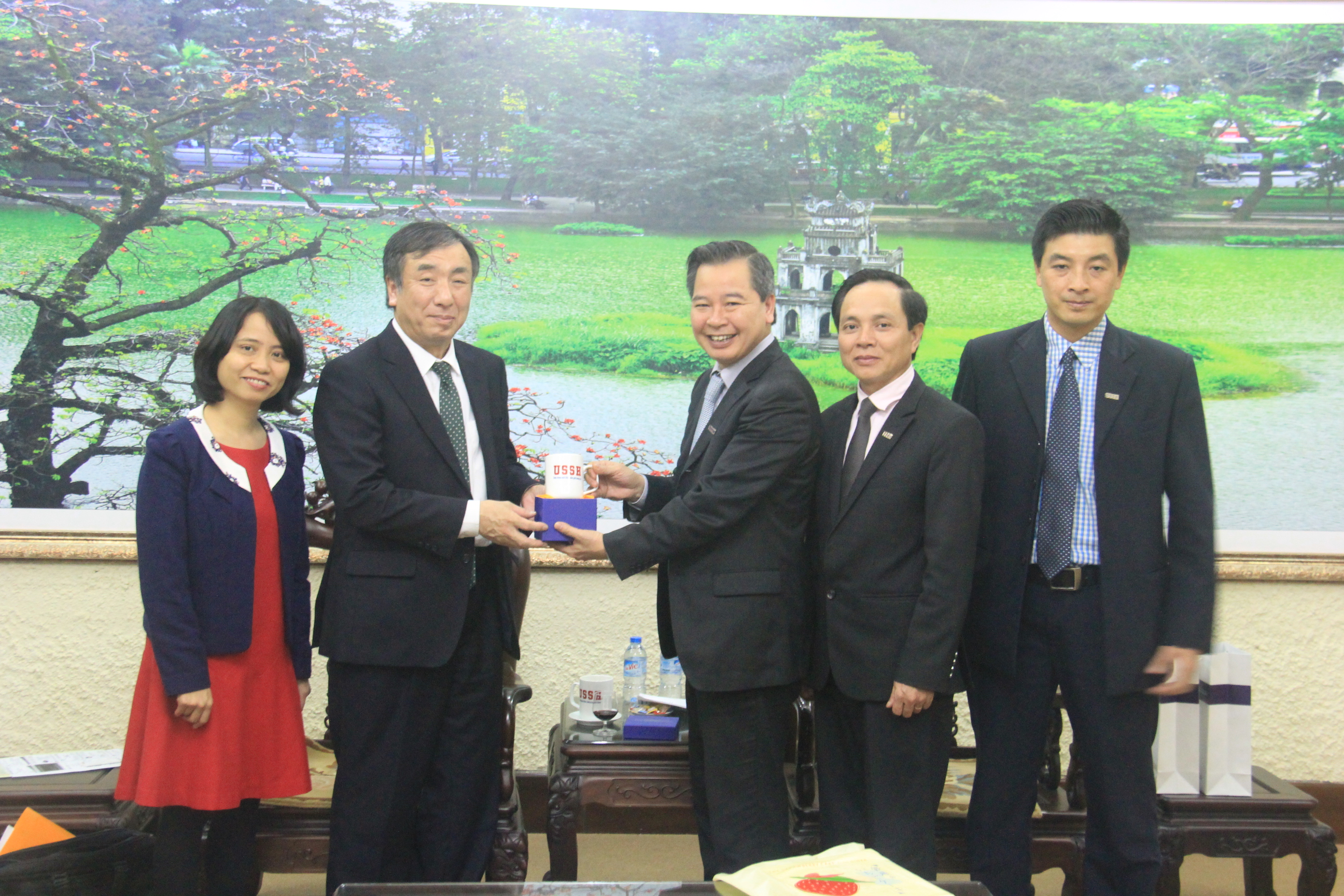 GS. TS Phạm Quang Minh (Hiệu trưởng Trường ĐHKHXH&NV) trao đổi quà lưu niệm với ông Jun Okudaira